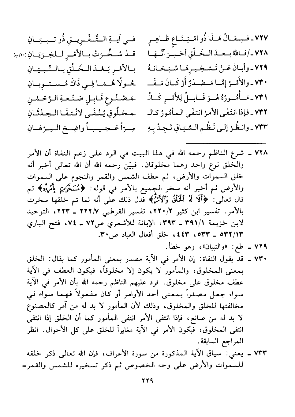 ٧٢٨ - شرع الناظم رحمه الله في هذا البيت في الرد على زعم النفاة أن الأمر والخلق نوع واحد وهما مخلوقان. فبين رحمه الله أن الله تعالى أخبر أنه خلق السموات والأرض، ثم عطف الشمس والقمر والنجوم على السموات والأرض ثم أخبر أنه سخر الجميع بالأمر في قوله: {مُسَخَّرَاتٍ بِأَمْرِهِ} ثم قال تعالى: {أَلَا لَهُ الْخَلْقُ وَالْأَمْرُ} فدل ذلك على أنه لما تم خلقها سخرت بالأمر. تفسير ابن كثير ٢/ ٢٢٠، تفسير القرطبي ٧/ ٢٢٢ - ٢٢٣، التوحيد لابن خزيمة ١/ ٣٩١ - ٣٩٣، الإبانة للأشعري ص ٧٢ - ٧٤، فتح الباري ١٣/ ٥٣٢ - ٥٣٣، ٤٤٣، خلق أفعال العباد ص ٣٠.