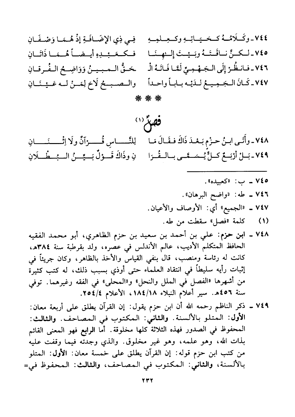 ٧٤٩ - ذكر الناظم رحمه الله أن ابن حزم يقول: إن القرآن يطلق على أربعة معان: الأول: المتلو بالألسنة. والثاني: المكتوب في المصاحف. والثالث: المحفوظ في الصدور فهذه الثلاثة كلها مخلوقة. أما الرابع فهو المعنى القائم بذات الله، وهو علمه، وهو غير مخلوق. والذي وجدته فيما وقفت عليه من كتب ابن حزم قوله: إن القرآن يطلق على خمسة معان: الأول: المتلو بالألسنة، والثاني: المكتوب في المصاحف، والثالث: المحفوظ في=