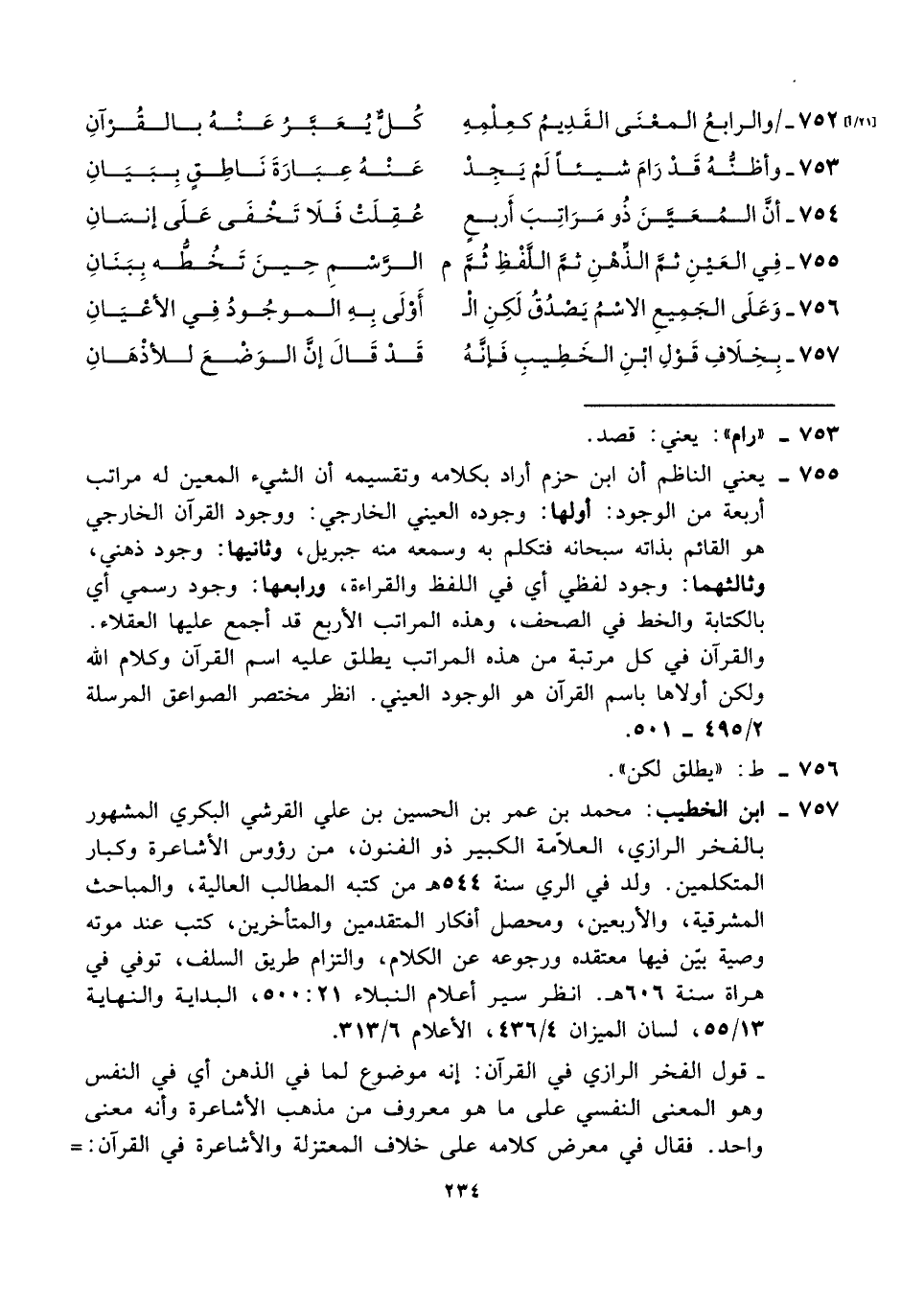٧٥٥ - يعني الناظم أن ابن حزم أراد بكلامه وتقسيمه أن الشيء المعين له مراتب أربعة من الوجود: أولها: وجوده العيني الخارجي: ووجود القرآن الخارجي هو القائم بذاته سبحانه فتكلم به وسمعه منه جبريل، وثانيها: وجود ذهني، وثالثهما: وجود لفظي أي في اللفظ والقراءة، ورابعها: وجود رسمي أي بالكتابة والخط في الصحف، وهذه المراتب الأربع قد أجمع عليها العقلاء. والقرآن في كل مرتبة من هذه المراتب يطلق عليه اسم القرآن وكلام الله ولكن أولاها باسم القرآن هو الوجود العيني. انظر مختصر الصواعق المرسلة ٢/ ٤٩٥ - ٥٠١.