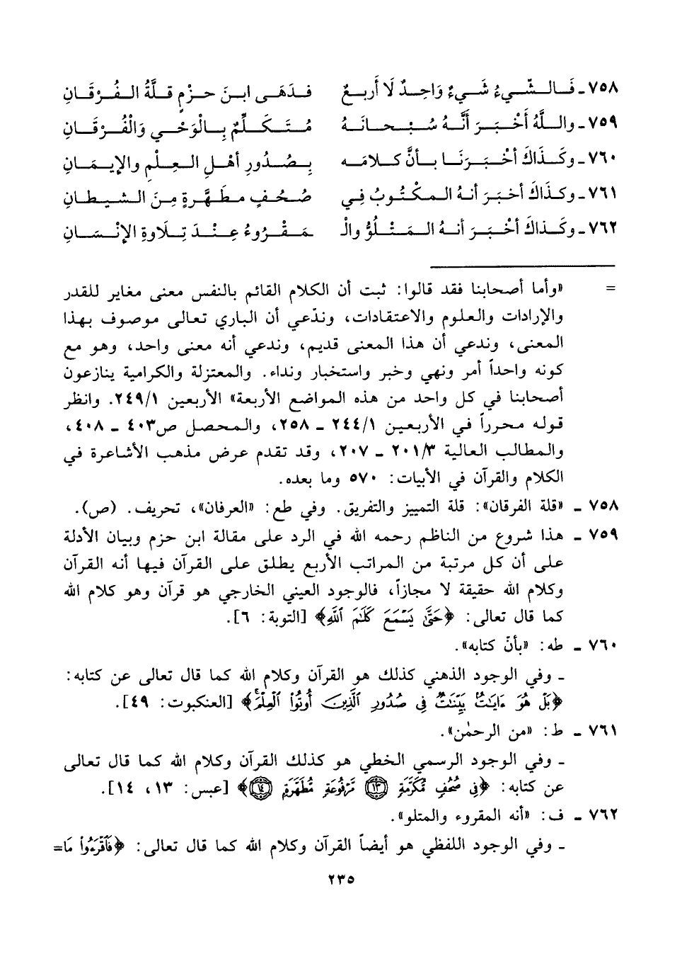 ٧٥٩ - هذا شروع من الناظم رحمه الله في الرد على مقالة ابن حزم وبيان الأدلة على أن كل مرتبة من المراتب الأربع يطلق على القرآن فيها أنه القرآن وكلام الله حقيقة لا مجازًا، فالوجود العيني الخارجي هو قرآن وهو كلام الله كما قال تعالى: {حَتَّى يَسْمَعَ كَلَامَ اللهِ} [التوبة: ٦].