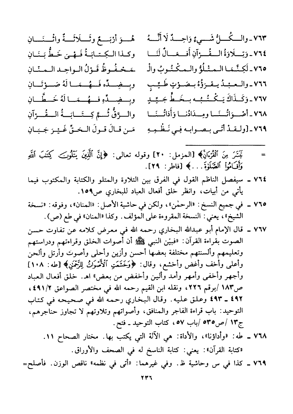 ٧٦٤ - سيفصل الناظم القول في الفرق بين التلاوة والمتلو والكتابة والمكتوب فيما يأتي من أبيات، وانظر خلق أفعال العباد للبخاري ص ١٥٩.