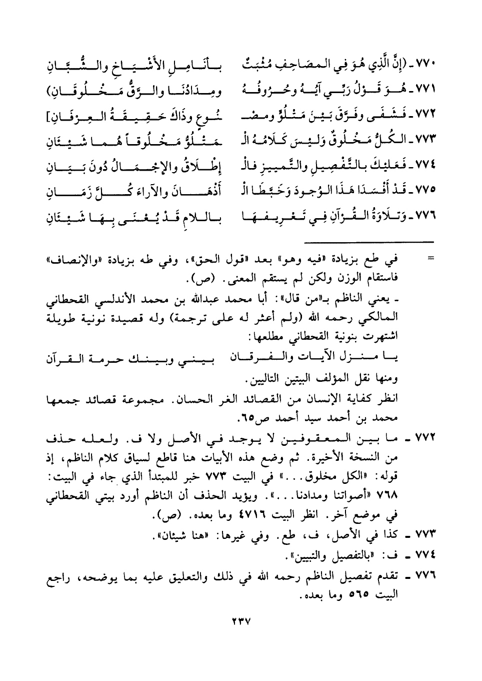 ٧٧٢ - ما بين المعقوفين لا يوجد في الأصل ولا ف. ولعله حذف من النسخة الأخيرة. ثم وضع هذه الأبيات هنا قاطع لسياق كلام الناظم، إذ قوله: "الكل مخلوق ... " في البيت ٧٧٣ خبر للمبتدأ الذي جاء في البيت: ٧٦٨ "أصواتنا ومدادنا ... ". ويؤيد الحذف أن الناظم أورد بيتي القحطاني في موضع آخر. انظر البيت ٤٧١٦ وما بعده. (ص).