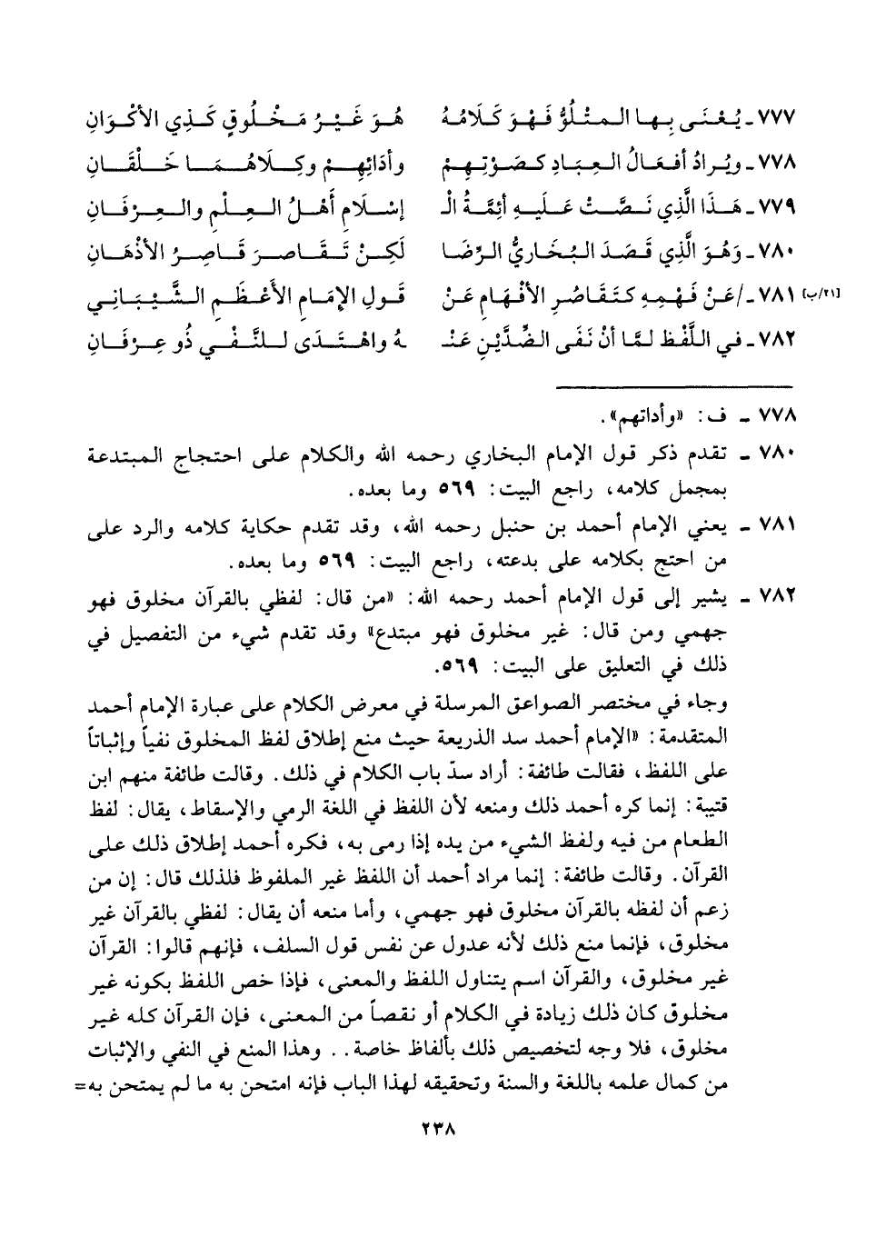 ٧٨٠ - تقدم ذكر قول الإمام البخاري رحمه الله والكلام على احتجاج المبتدعة بمجمل كلامه، راجع البيت: ٥٦٩ وما بعده.