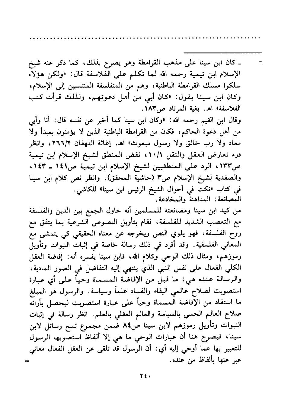 = - كان ابن سينا على مذهب القرامطة وهو يصرح بذلك، كما ذكر عنه شيخ الإسلام ابن تيمية رحمه الله لما تكلم على الفلاسفة قال: "ولكن هؤلاء سلكوا مسلك القرامطة الباطنية، وهم من المتفلسفة المنتسبين إلى الإسلام، وكان ابن سينا يقول: "كان أبي من أهل دعوتهم، ولذلك قرأت كتب الفلاسفة" اهـ. بغية المرتاد ص ١٨٣.