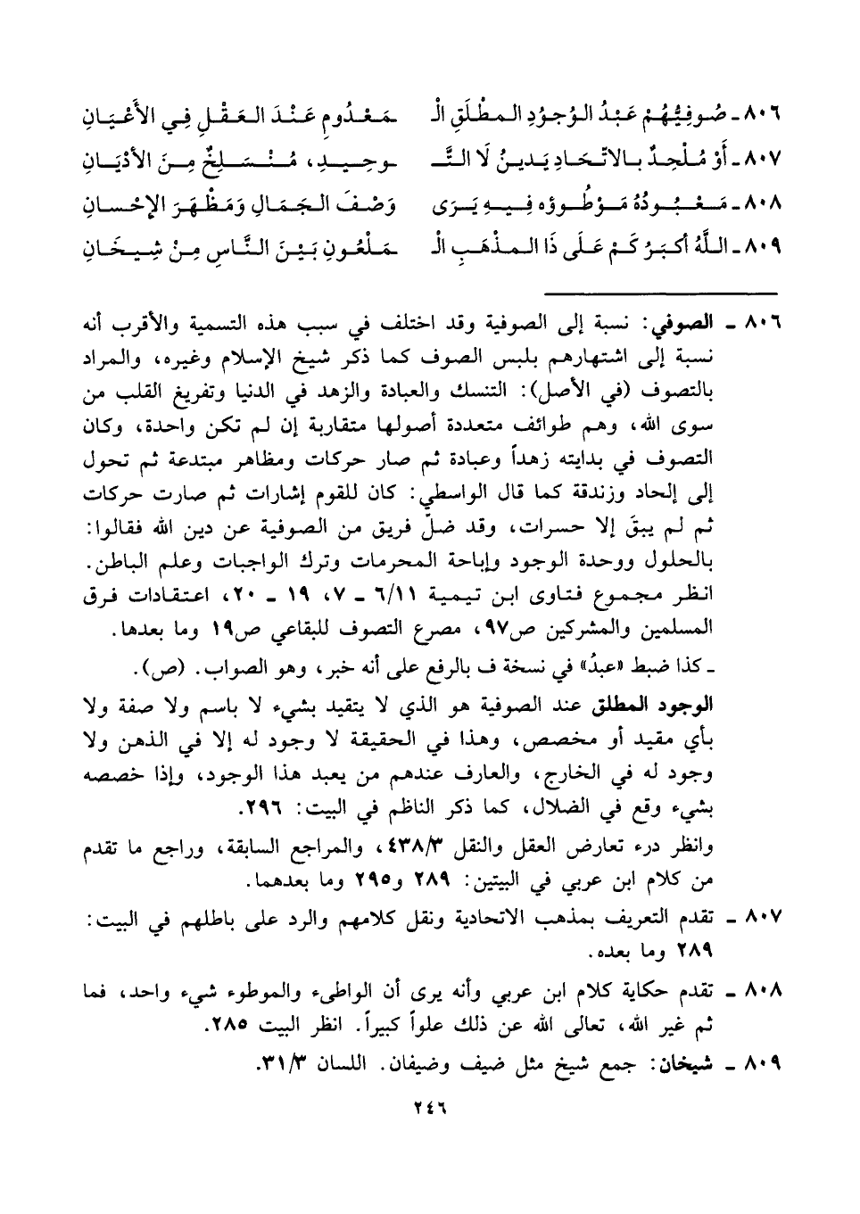 ٨٠٦ - صُوفِيُّهُم عَبدُ الوُجوُدِ المطْلَقِ الـ ... ـمَعْدُومِ عَنْدَ العَقْلِ فِي الأَعْيَانِ