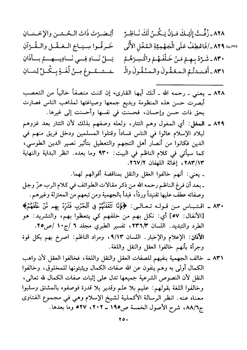 ٨٢٩ - المغل: أي المغول وهم التتار، ولعله وصفهم بذلك لأن التتار بعد غزوهم لبلاد الإسلام عاثوا في الناس فسادًا وقتلوا المسلمين ودخل فريق منهم في الدين فكانوا من أنصار أهل التجهم والتعطيل بتأثير نصير الدين الطوسي، كما سيأتي في كلام الناظم في البيت: ٩٣٠ وما بعده. انظر البداية والنهاية ١٣/ ٢٨٣، إغاثة اللهفان ٢/ ٢٦٧.