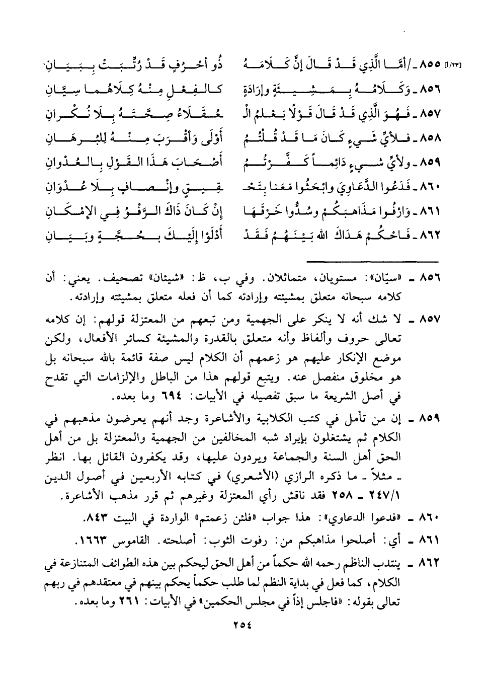 ٨٥٦ - وَكَلَامُهُ بمَشيئَةٍ وإِرادَةٍ ... كالفِعْلِ مِنْهُ كِلَاهُما سِيَّانِ