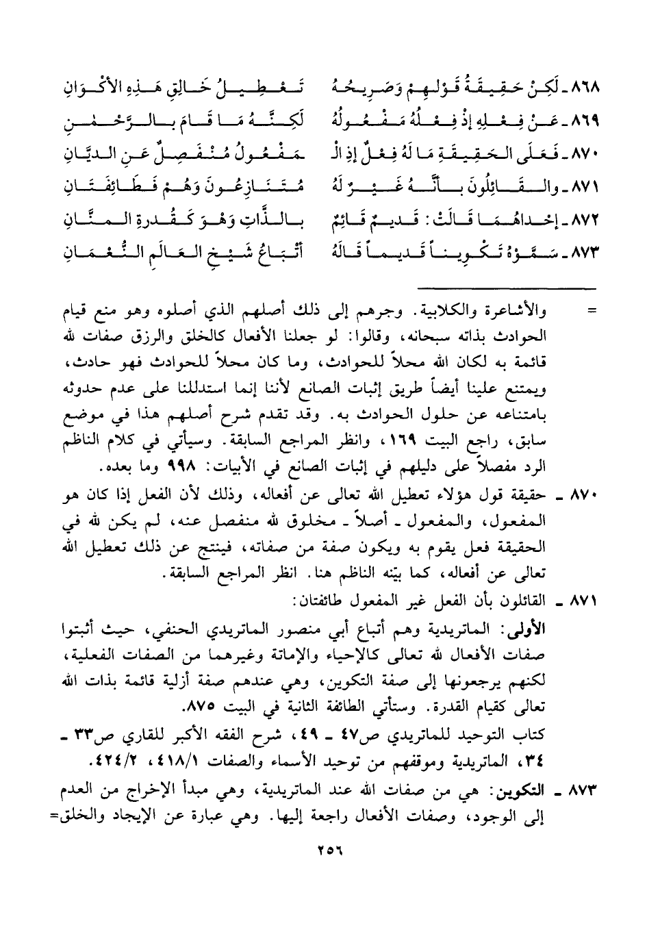 الأولى: الماتريدية وهم أتباع أبي منصور الماتريدي الحنفي، حيث أثبتوا صفات الأفعال لله تعالى كالإحياء والإماتة وغيرهما من الصفات الفعلية، لكنهم يرجعونها إلى صفة التكوين، وهي عندهم صفة أزلية قائمة بذات الله تعالى كقيام القدرة. وستأتي الطائفة الثانية في البيت ٨٧٥.