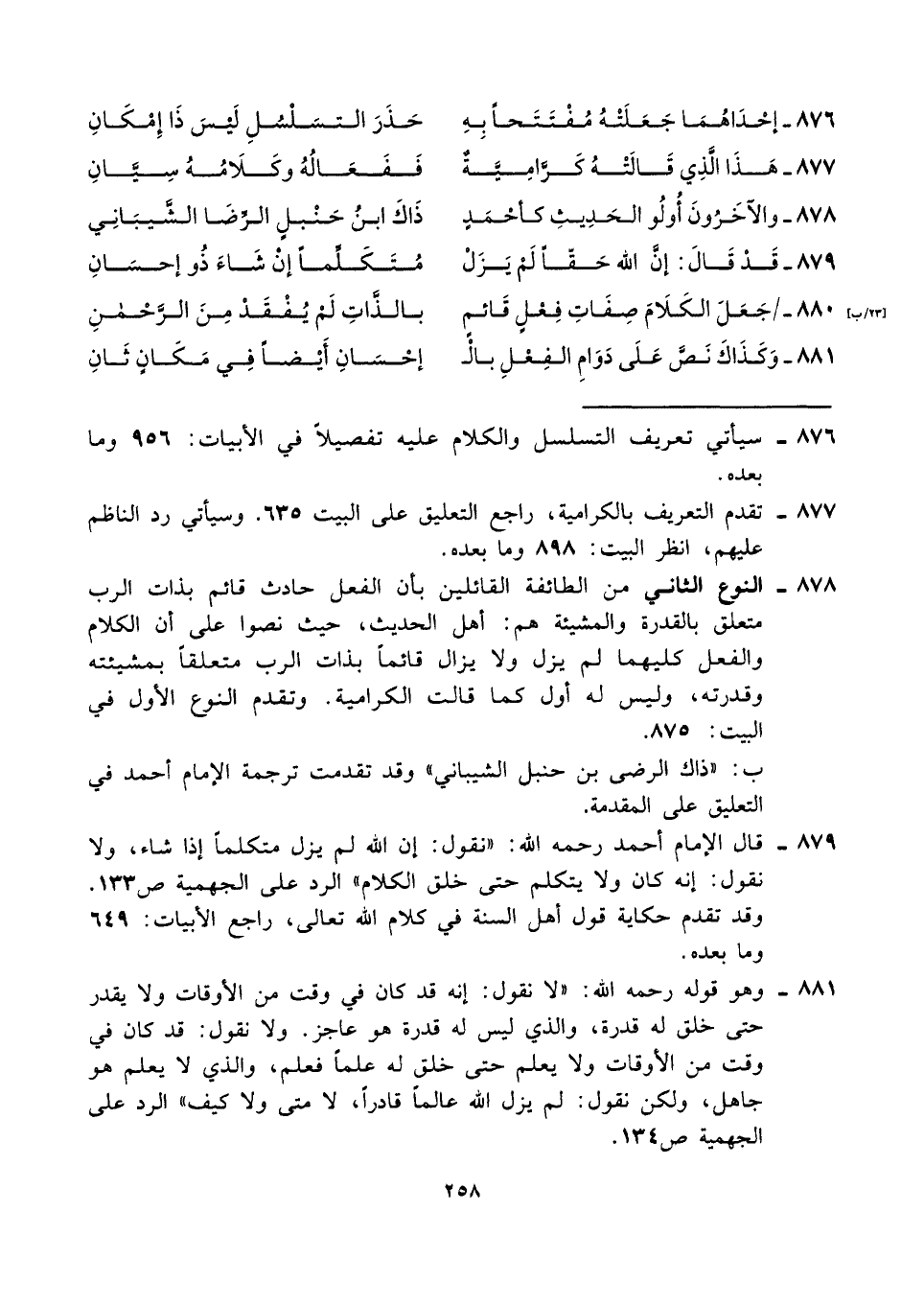 ٨٧٧ - تقدم التعريف بالكرامية، راجع التعليق على البيت ٦٣٥. وسيأتي رد الناظم عليهم، انظر البيت: ٨٩٨ وما بعده.