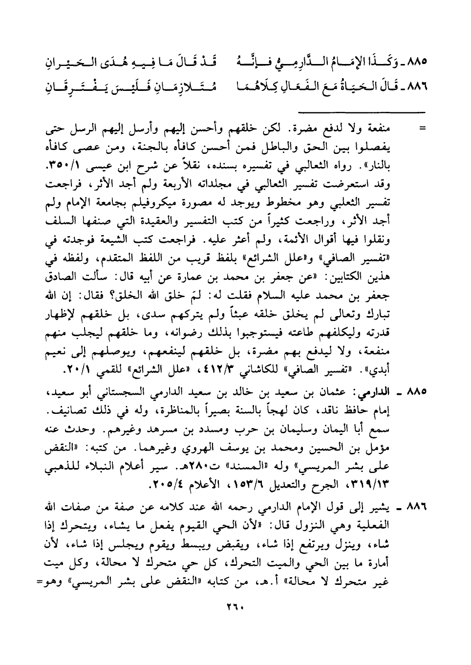 ٨٨٦ - يشير إلى قول الإمام الدارمي رحمه الله عند كلامه عن صفة من صفات الله الفعلية وهي النزول قال: "لأن الحي القيوم يفعل ما يشاء، ويتحرك إذا شاء، وينزل ويرتفع إذا شاء، ويقبض ويبسط ويقوم ويجلس إذا شاء، لأن أمارة ما بين الحي والميت التحرك، كل حي متحرك لا محالة، وكل ميت غير متحرك لا محالة" أ. هـ، من كتابه "النقض على بشر المريسي" وهو =