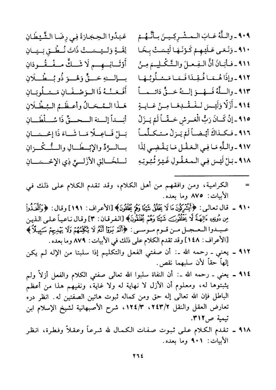 ٩١٨ - تقدم الكلام على ثبوت صفات الكمال لله شرعًا وعقلًا وفطرة، انظر الأبيات: ٩٠١ وما بعده.