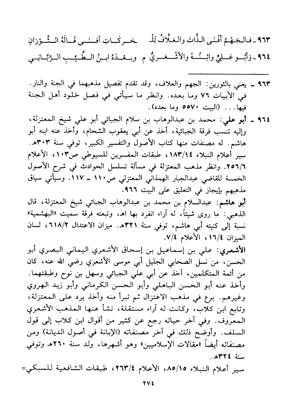 ٩٦٤ - أبو علي: محمد بن عبد الوهاب بن سلام الجبائي أبو علي شيخ المعتزلة، وإليه تنسب فرقة الجبائية، أخذ عن أبي يعقوب الشحام، وأخذ عنه ابنه أبو هاشم. له مصنفات منها كتاب الأصول والتفسير الكبير، توفي سنة ٣٠٣ هـ. سير أعلام النبلاء ١٤/ ١٨٣، طبقات المفسرين للسيوطي ص ١٠٣، الأعلام ٦/ ٢٥٦. وانظر مذهب المعتزلة في مسألة تسلسل الحوادث في شرح الأصول الخمسة للقاضي عبد الجبار الهمذاني المعتزلي ص ١١٠ - ١١٧. وسيأتي سياق مذهبهم بإيجاز في التعليق على البيت ٩٦٦.