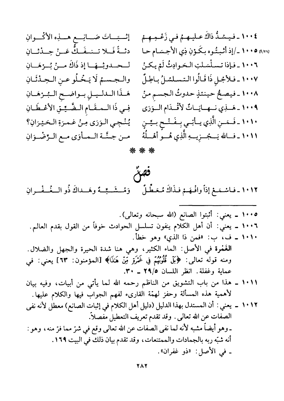 ١٠١٢ - فاسْمَعْ إذًا وافْهَمْ فذَاكَ مُعَطِّلٌ ... وَمُشَبِّهٌ وهَداكَ ذُو الغُفْرانِ