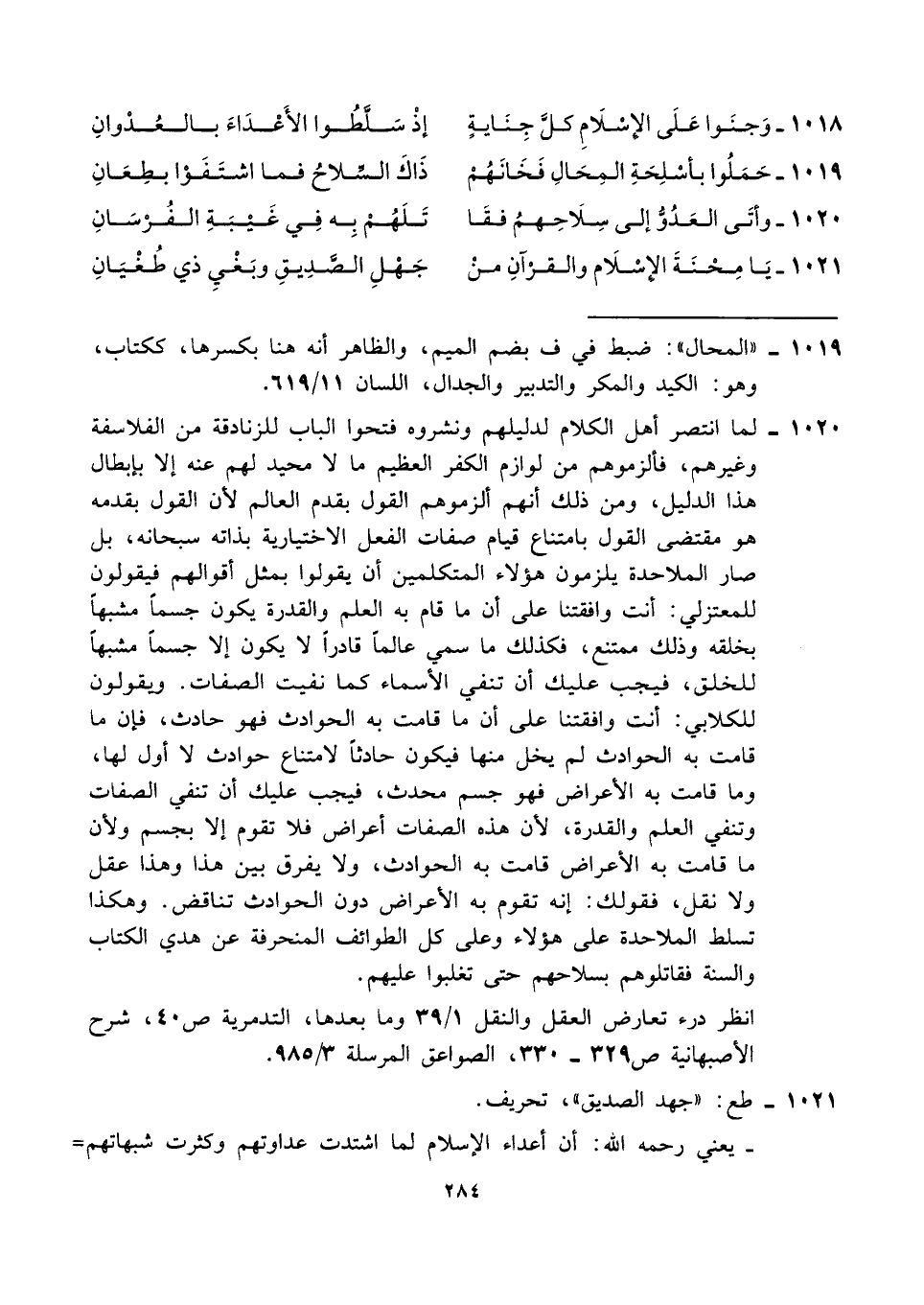 ١٠٢٠ - لما انتصر أهل الكلام لدليلهم ونشروه فتحوا الباب للزنادقة من الفلاسفة وغيرهم، فألزموهم من لوازم الكفر العظيم ما لا محيد لهم عنه إلا بإبطال هذا الدليل، ومن ذلك أنهم ألزموهم القول بقدم العالم لأن القول بقدمه هو مقتضى القول بامتناع قيام صفات الفعل الاختيارية بذاته سبحانه، بل صار الملاحدة يلزمون هؤلاء المتكلمين أن يقولوا بمثل أقوالهم فيقولون للمعتزلي: أنت وافقتنا على أن ما قام به العلم والقدرة يكون جسمًا مشبهًا بخلقه وذلك ممتنع، فكذلك ما سمي عالمًا قادرًا لا يكون إلا جسمًا مشبهًا للخلق، فيجب عليك أن تنفي الأسماء كما نفيت الصفات. ويقولون للكلابي: أنت وافقتنا على أن ما قامت به الحوادث فهو حادث، فإن ما قامت به الحوادث لم يخل منها فيكون حادثًا لامتناع حوادث لا أول لها، وما قامت به الأعراض فهو جسم محدث، فيجب عليك أن تنفي الصفات وتنفي العلم والقدرة، لأن هذه الصفات أعراض فلا تقوم إلا بجسم ولأن ما قامت به الأعراض قامت به الحوادث، ولا يفرق بين هذا وهذا عقل ولا نقل، فقولك: إنه تقوم به الأعراض دون الحوادث تناقض. وهكذا تسلط الملاحدة على هؤلاء وعلى كل الطوائف المنحرفة عن هدي الكتاب والسنة فقاتلوهم بسلاحهم حتى تغلبوا عليهم.