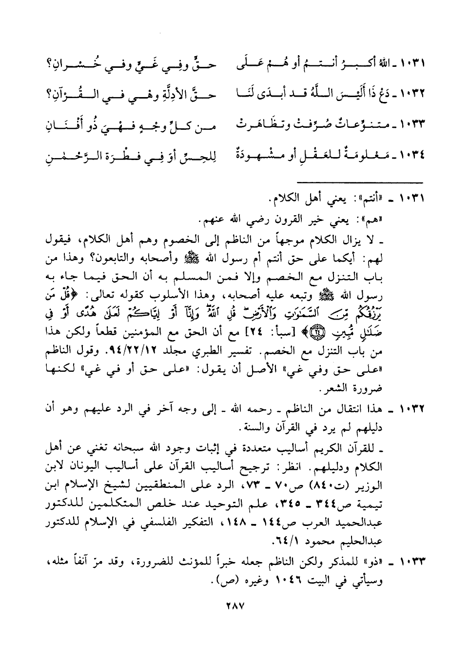 ١٠٣٤ - مَعْلومَةٌ للعَقْلِ أو مشْهودَةٌ ... لِلحِسِّ أوَ فِي فطْرَة الرَّحْمنِ