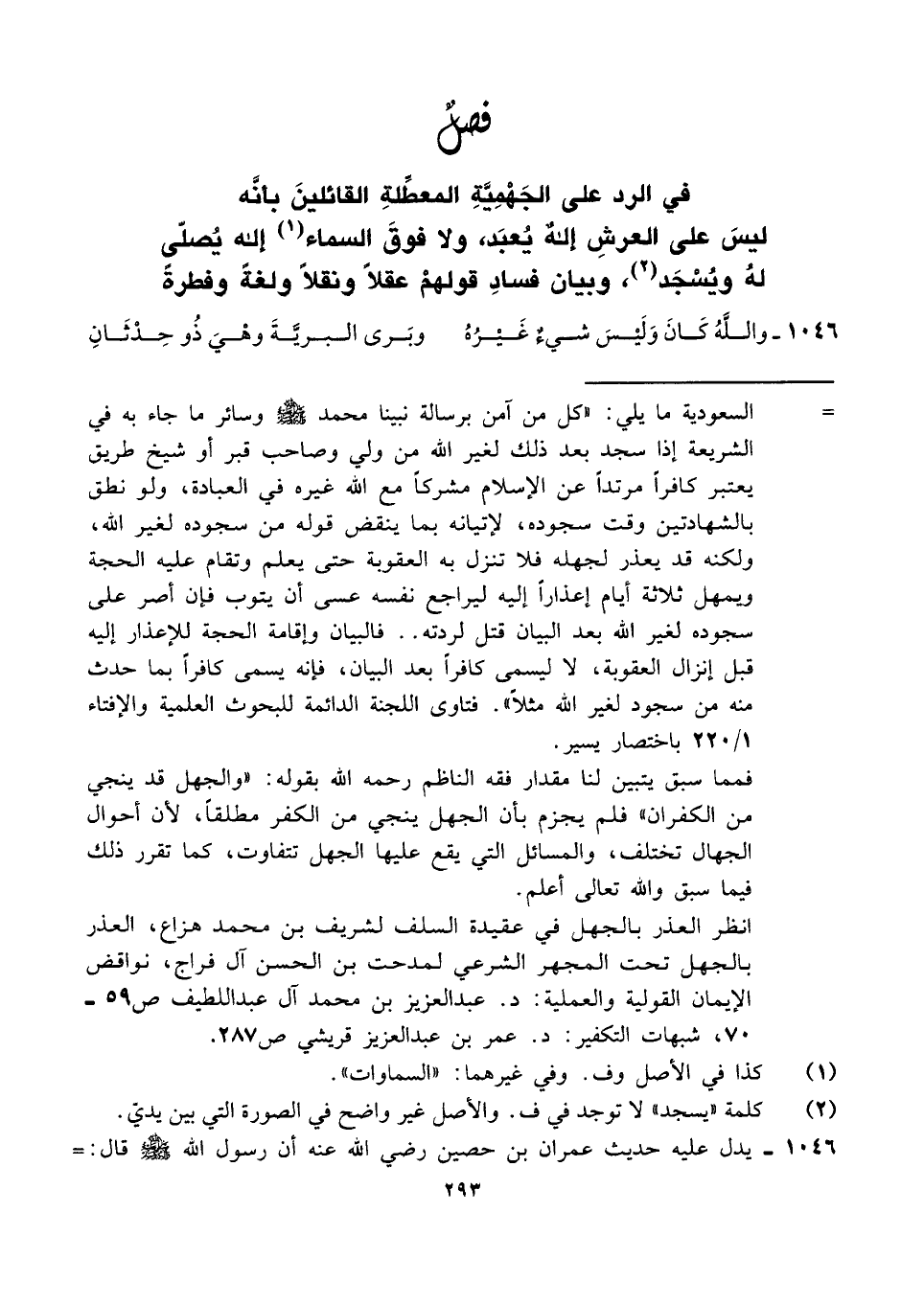 فصلٌ في الرد على الجَهْمِيَّةِ المعطِّلةِ القائلينَ بأنَّه ليسَ علي العرشِ إلهٌ يُعبَد، ولا فوقَ السماء (¬١) إله يُصلّى لهُ ويُسْجَد (¬٢)، وبيان فسادِ قولهمْ عقلًا ونقلًا ولغةً وفطرةً