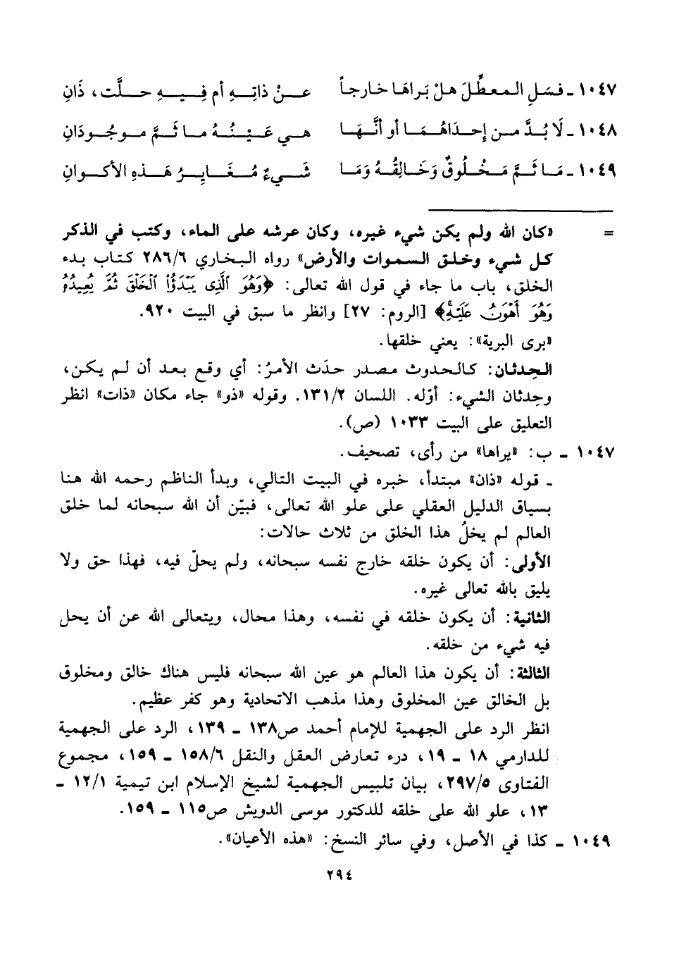 = "كان الله ولم يكن شيء غيره، وكان عرشه على الماء، وكتب في الذكر كل شيء وخلق السموات والأرض" رواه البخاري ٦/ ٢٨٦ كتاب بدء الخلق، باب ما جاء في قول الله تعالى: {وَهُوَ الَّذِي يَبْدَأُ الْخَلْقَ ثُمَّ يُعِيدُهُ وَهُوَ أَهْوَنُ عَلَيْهِ} [الروم: ٢٧] وانظر ما سبق في البيت ٩٢٠.