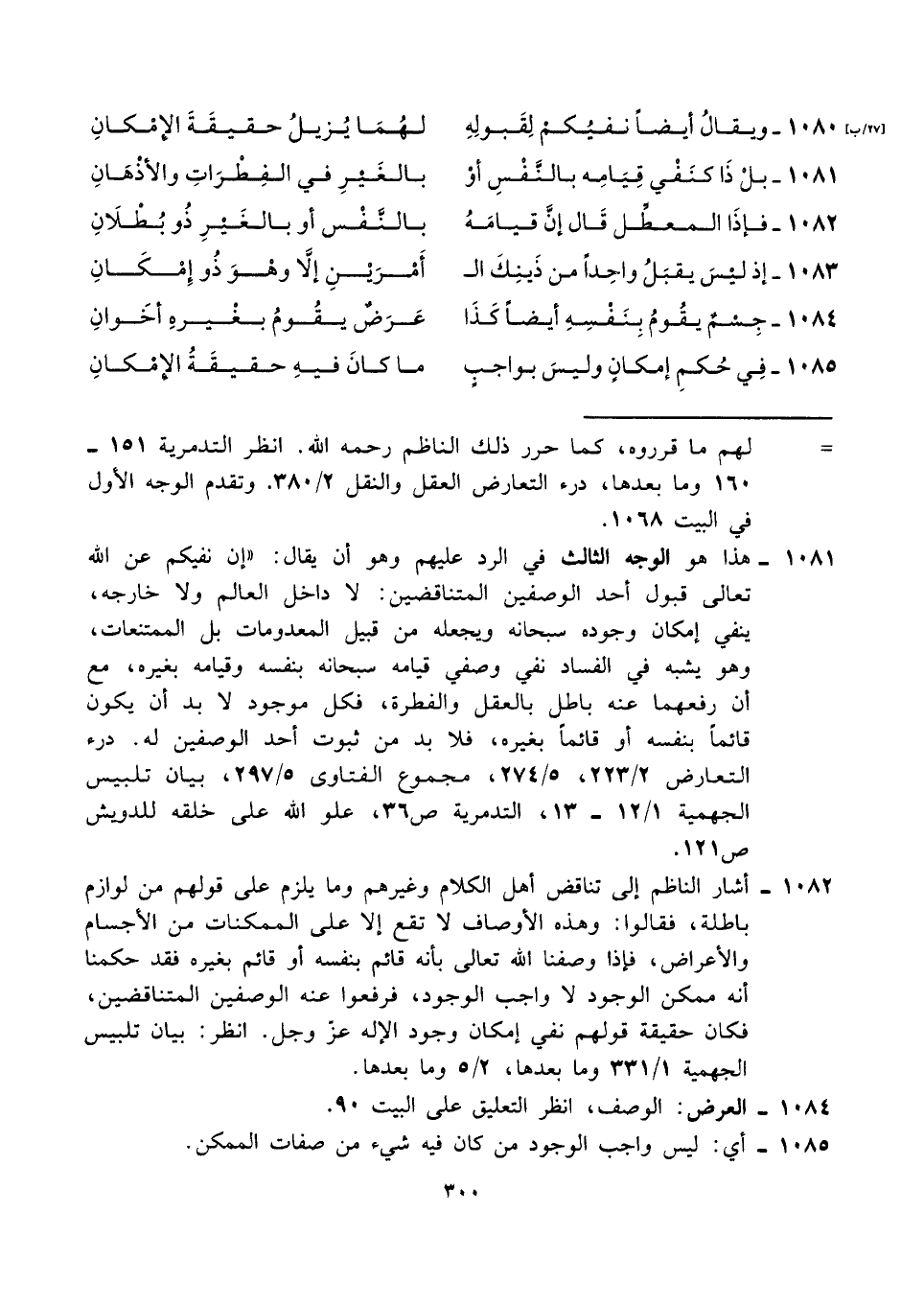 = لهم ما قرروه، كما حرر ذلك الناظم رحمه الله. انظر التدمرية ١٥١ - ١٦٠ وما بعدها، درء التعارض العقل والنقل ٢/ ٣٨٠. وتقدم الوجه الأول في البيت ١٠٦٨.