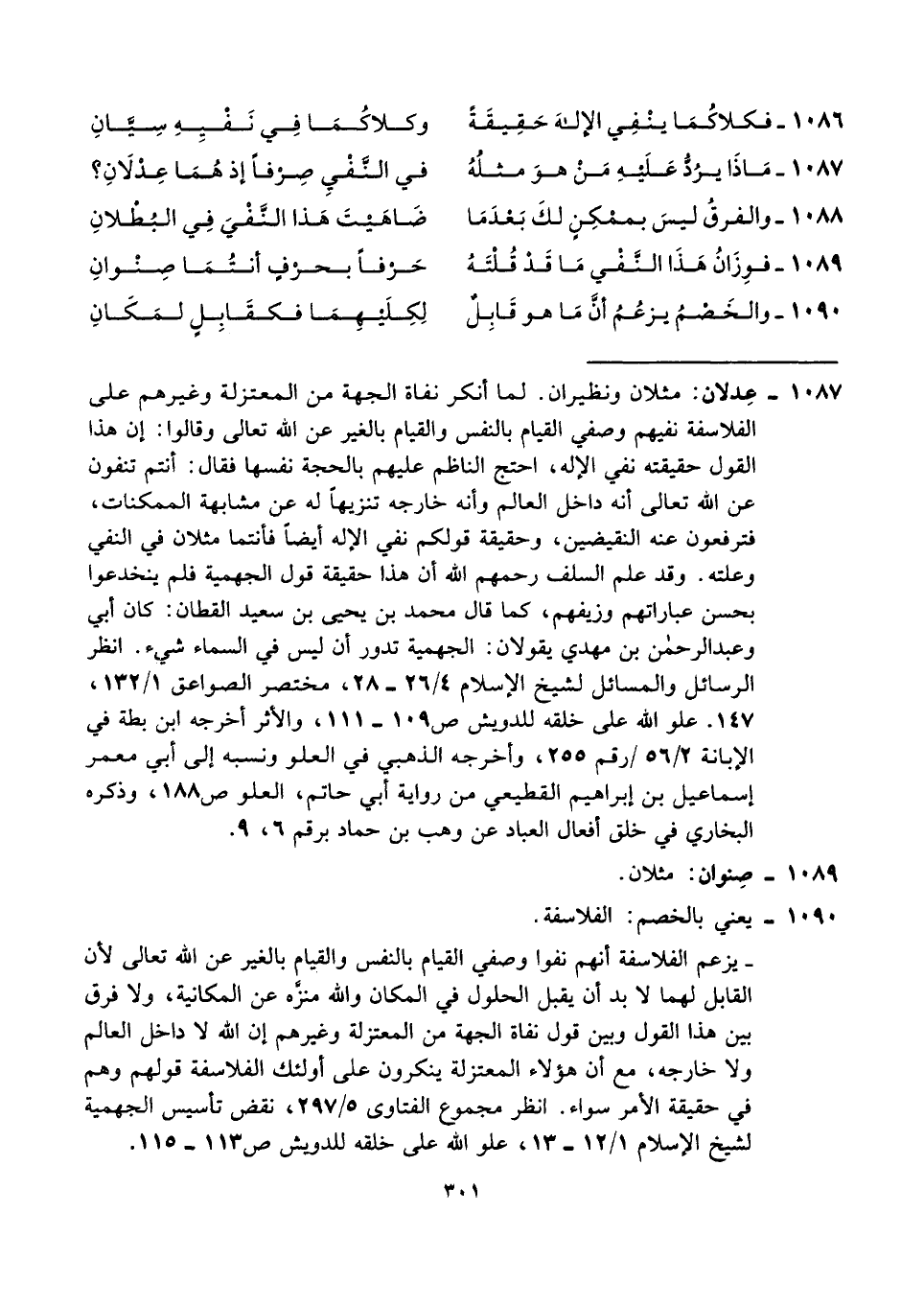١٠٨٧ - عِدلان: مثلان ونظيران. لما أنكر نفاة الجهة من المعتزلة وغيرهم على الفلاسفة نفيهم وصفي القيام بالنفس والقيام بالغير عن الله تعالى وقالوا: إن هذا القول حقيقته نفي الإله، احتج الناظم عليهم بالحجة نفسها فقال: أنتم تنفون عن الله تعالى أنه داخل العالم وأنه خارجه تنزيهًا له عن مشابهة الممكنات، فترفعون عنه النقيضين، وحقيقة قولكم نفي الاله أيضًا فأنتما مثلان في النفي وعلته. وقد علم السلف رحمهم الله أن هذا حقيقة قول الجهمية فلم ينخدعوا بحسن عباراتهم وزيفهم، كما قال محمد بن يحيى بن سعيد القطان: كان أبي وعبد الرحمن بن مهدي يقولان: الجهمية تدور أن ليس في السماء شيء. انظر الرسائل والمسائل لشيخ الإسلام ٤/ ٢٦ - ٢٨، مختصر الصواعق ١/ ١٣٢، ١٤٧. علو الله على خلقه للدويش ص ١٠٩ - ١١١، والأثر أخرجه ابن بطة في الإبانة ٢/ ٥٦ /رقم ٢٥٥، وأخرجه الذهبي في العلو ونسبه إلى أبي معمر إسماعيل بن إبراهيم القطيعي من رواية أبي حاتم، العلو ص ١٨٨، وذكره البخاري في خلق أفعال العباد عن وهب بن حماد برقم ٦، ٩.