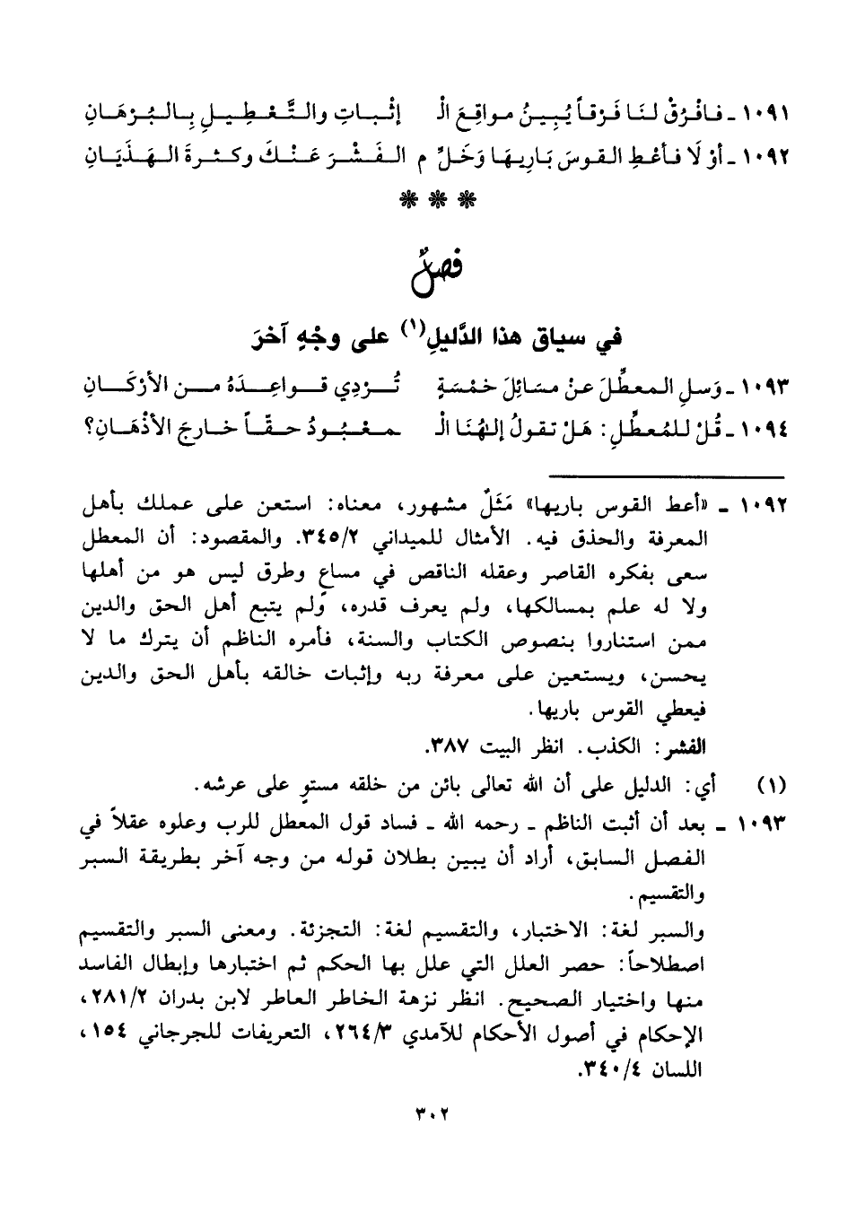 ١٠٩٣ - بعد أن أثبت الناظم -رحمه الله- فساد قول المعطل للرب وعلوه عقلًا في الفصل السابق، أراد أن يبين بطلان قوله من وجه آخر بطريقة السبر والتقسيم.