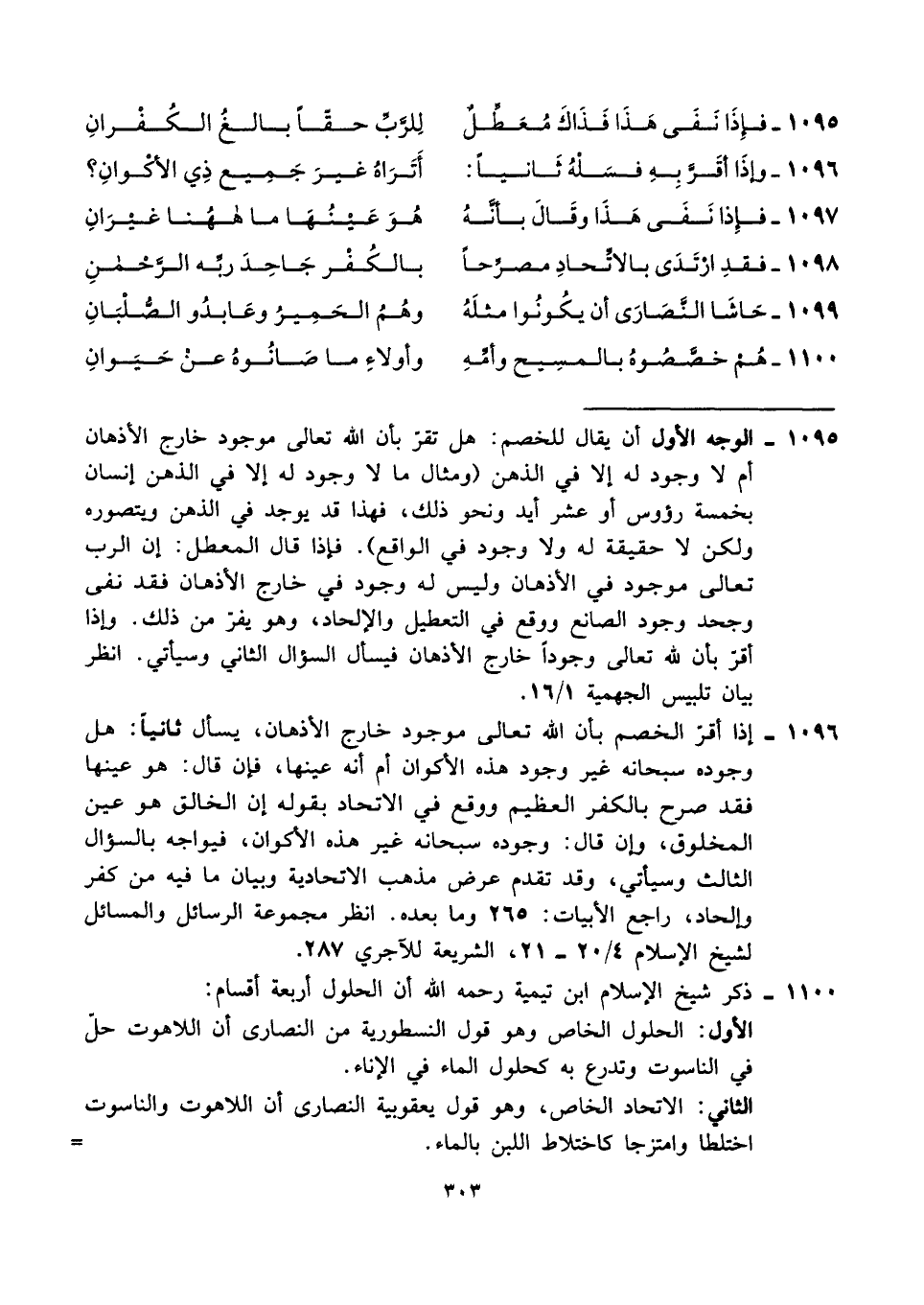 ١٠٦٩ - إذا أقرَّ الخصم بأن الله تعالى موجود خارج الأذهان، يسأل ثانيًا: هل وجوده سبحانه غير وجود هذه الأكوان أم أنه عينها، فإن قال: هو عينها فقد صرح بالكفر العظيم ووقع في الاتحاد بقوله إن الخالق هو عين المخلوق، وإن قال: وجوده سبحانه غير هذه الأكوان، فيواجه بالسؤال الثالث وسيأتي، وقد تقدم عرض مذهب الاتحادية وبيان ما فيه من كفر وإلحاد، راجع الأبيات: ٢٦٥ وما بعده. انظر مجموعة الرسائل والمسائل لشيخ الإسلام ٤/ ٢٠ - ٢١، الشريعة للآجري ٢٨٧.