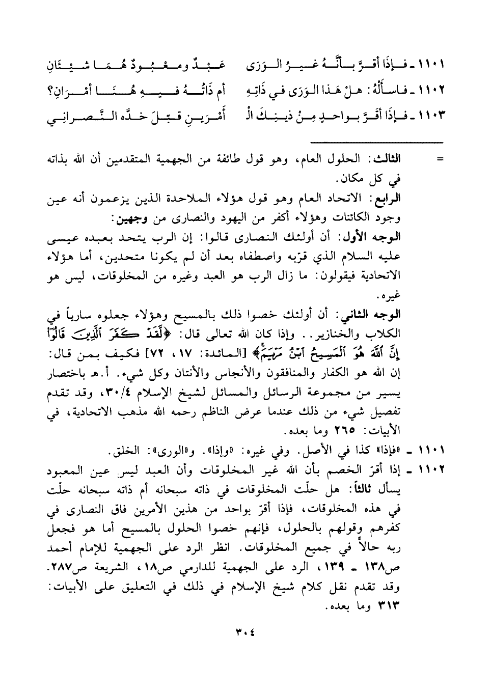 ١١٠٢ - إذا أقرّ الخصم بأن الله غير المخلوقات وأن العبد ليس عين المعبود يسأل ثالثًا: هل حلّت المخلوقات في ذاته سبحانه أم ذاته سبحانه حلّت في هذه المخلوقات، فإذا أقرّ بواحد من هذين الأمرين فاق النصارى في كفرهم وقولهم بالحلول، فإنهم خصوا الحلول بالمسيح أما هو فجعل ربه حالًّا في جميع المخلوقات. انظر الرد على الجهمية للإمام أحمد ص ١٣٨ - ١٣٩، الرد على الجهمية للدارمي ص ١٨، الشريعة ص ٢٨٧. وقد تقدم نقل كلام شيخ الإسلام في ذلك في التعليق على الأبيات: ٣١٣ وما بعده.