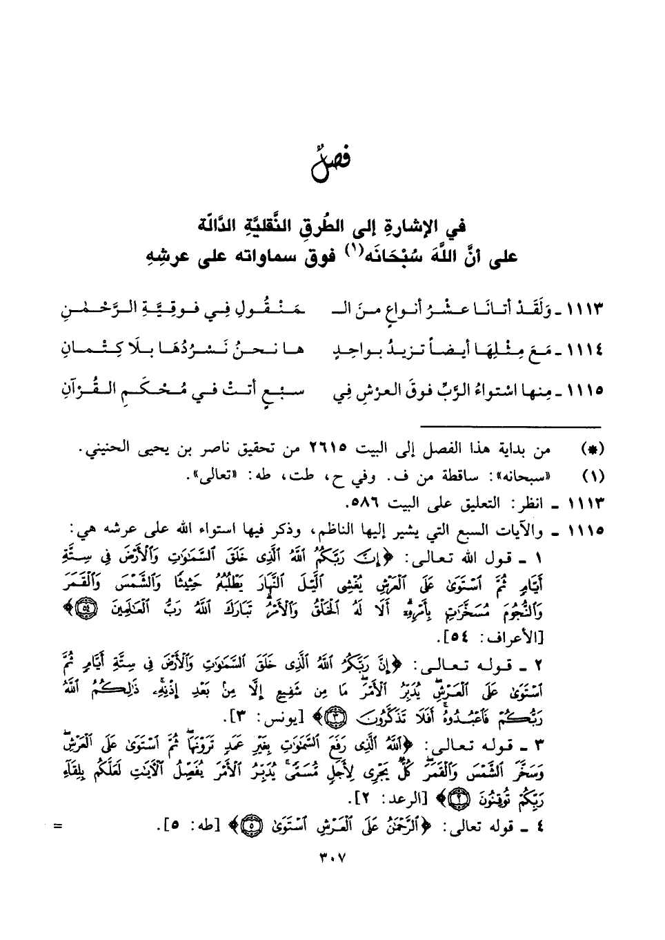 ١١١٥ - مِنها اسْتواءُ الرَّبِّ فوقَ العرْشِ فِي ... سبْعٍ أتتْ في مُحْكَمِ القُرْآنِ