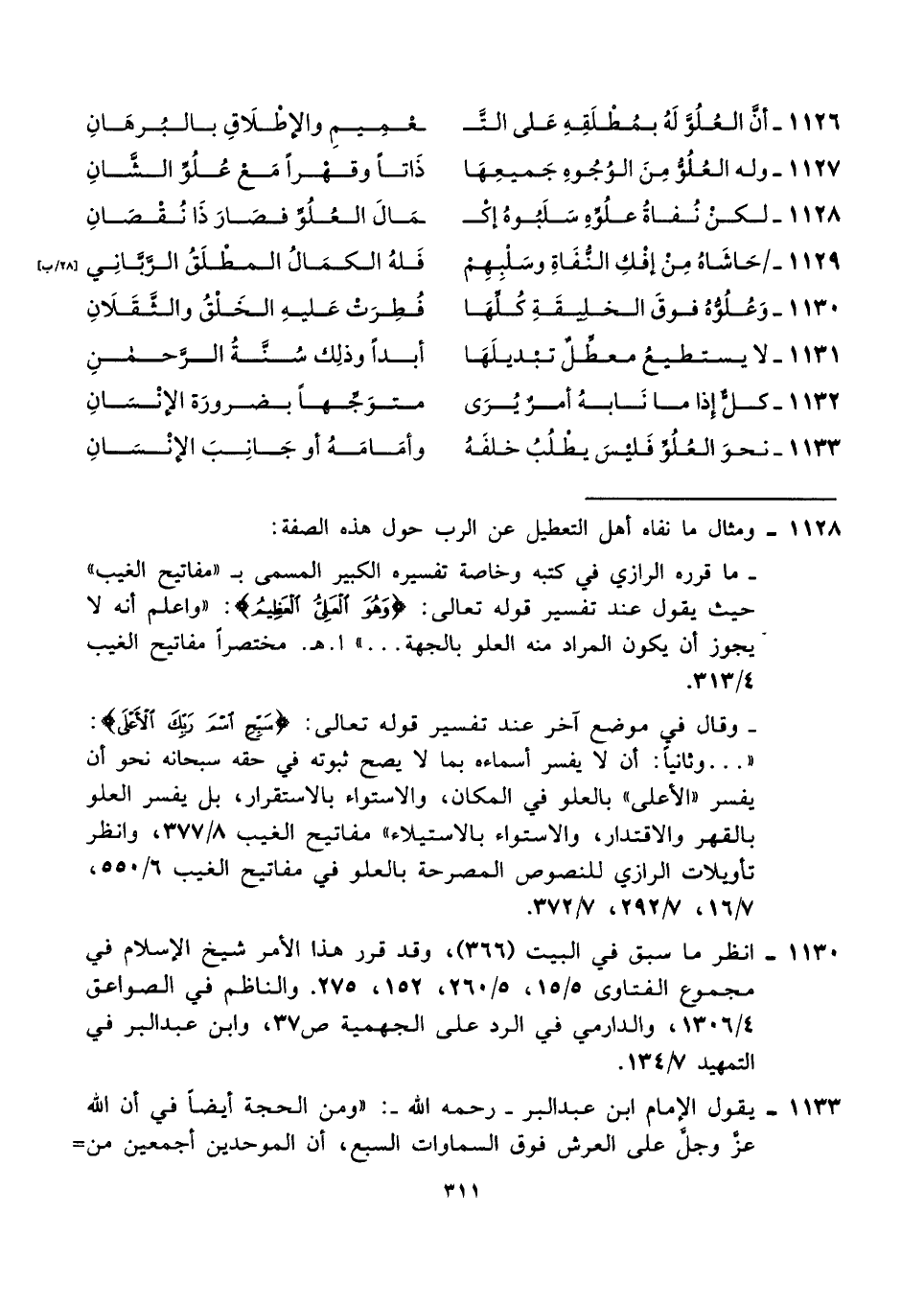 ١١٢٨ - لكنْ نُفاةُ علُوِّهِ سَلَبُوهُ إكْـ ... ـمَالَ العُلُوِّ فصَارَ ذَا نُقْصَانِ