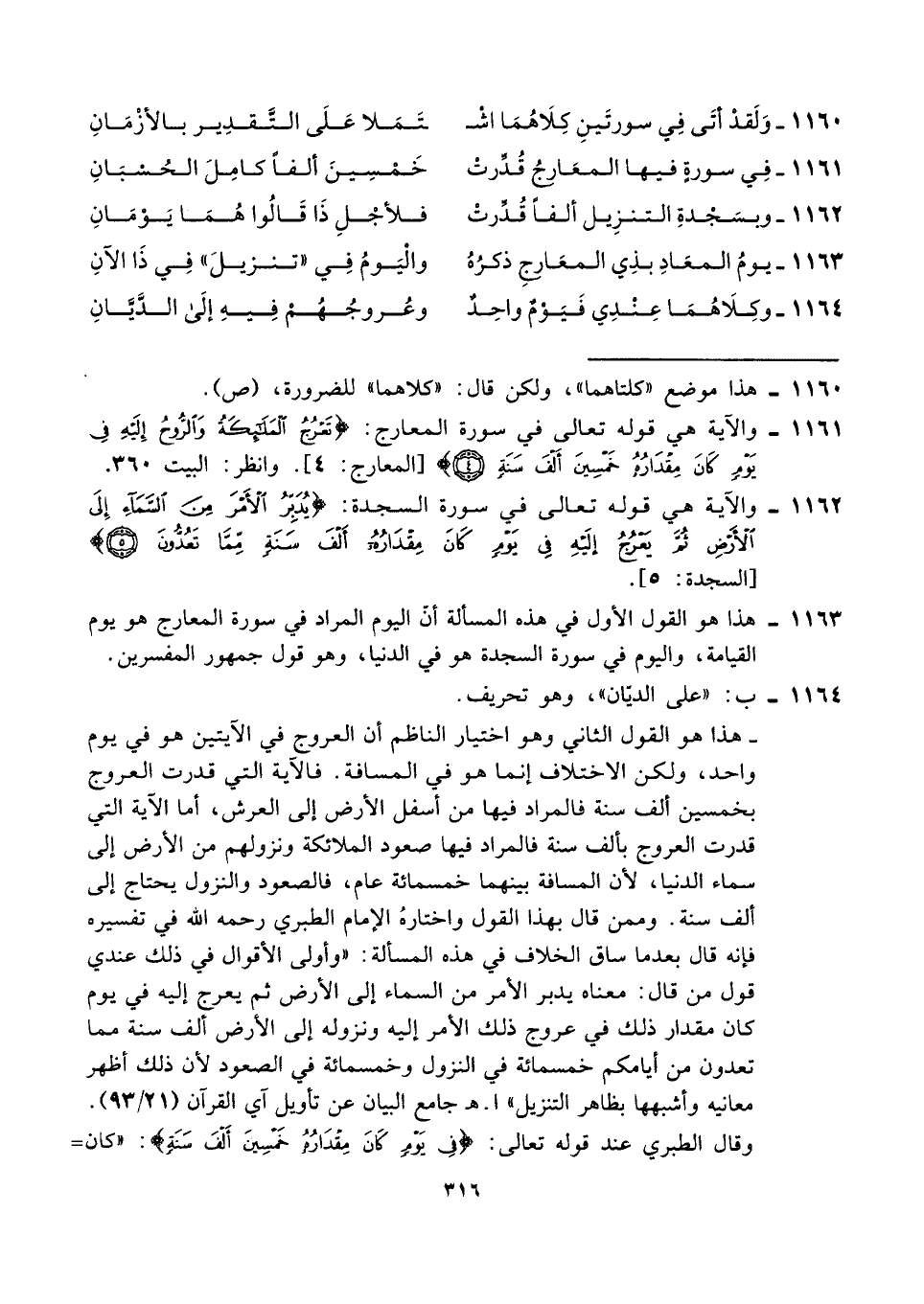 ١١٦١ - والآية هي قوله تعالى في سورة المعارج: {تَعْرُجُ الْمَلَائِكَةُ وَالرُّوحُ إِلَيْهِ فِي يَوْمٍ كَانَ مِقْدَارُهُ خَمْسِينَ أَلْفَ سَنَةٍ (٤)} [المعارج: ٤]. وانظر: البيت ٣٦٠.