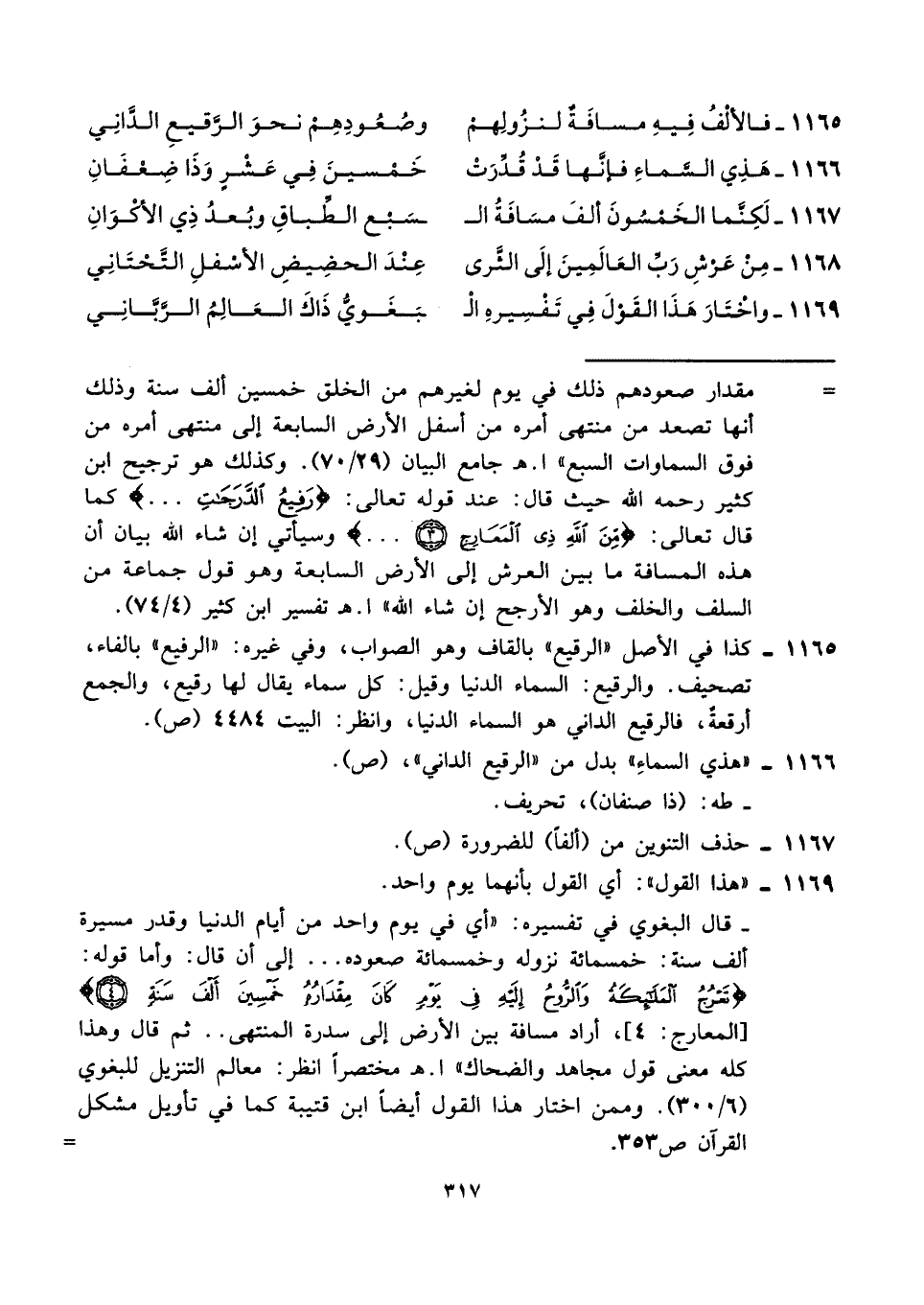 ١١٦٧ - لَكِنَّما الخَمْسُونَ ألفَ مسَافَةُ الـ ... ـسَبْع الطِّباقِ وبُعدُ ذِي الأكْوَانِ