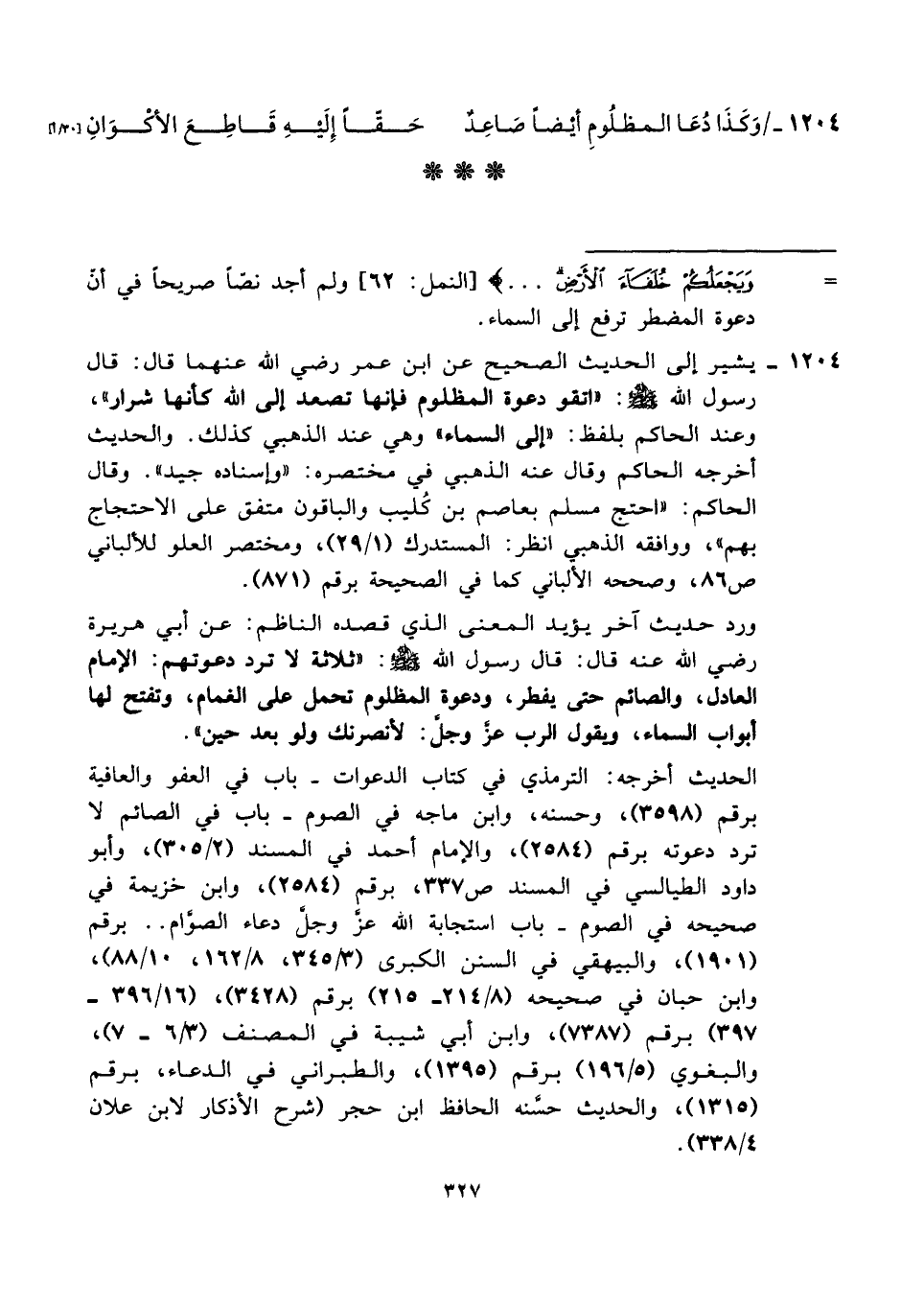 ١٢٠٤ - يشير إلى الحديث الصحيح عن ابن عمر رضي الله عنهما قال: قال رسول الله - صلى الله عليه وسلم -: "اتقو دعوة المظلوم فإنها تصعد إلى الله كأنها شرار"، وعند الحاكم بلفظ: "إلى السماء" وهي عند الذهبي كذلك. والحديث أخرجه الحاكم وقال عنه الذهبي في مختصره: "وإسناده جيد". وقال الحاكم: "احتج مسلم بعاصم بن كُليب والباقون متفق على الاحتجاج بهم"، ووافقه الذهبي انظر: المستدرك (ا/ ٢٩)، ومختصر العلو للألباني ص ٨٦، وصححه الألباني كما في الصحيحة برقم (٨٧١).