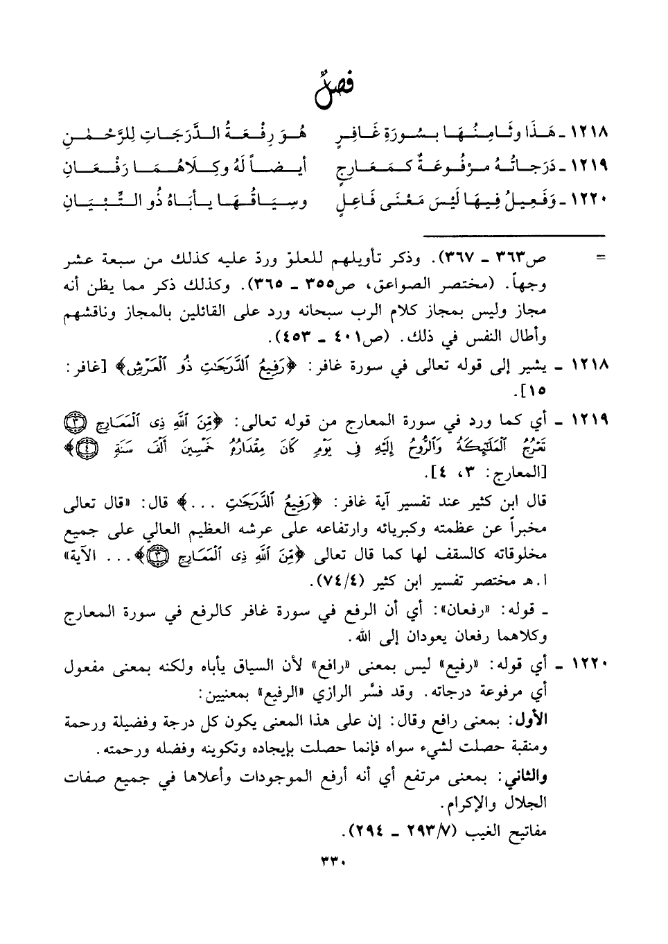 ١٢١٨ - يشير إلى قوله تعالى في سورة غافر: {رَفِيعُ الدَّرَجَاتِ ذُو الْعَرْشِ} [غافر: ١٥].