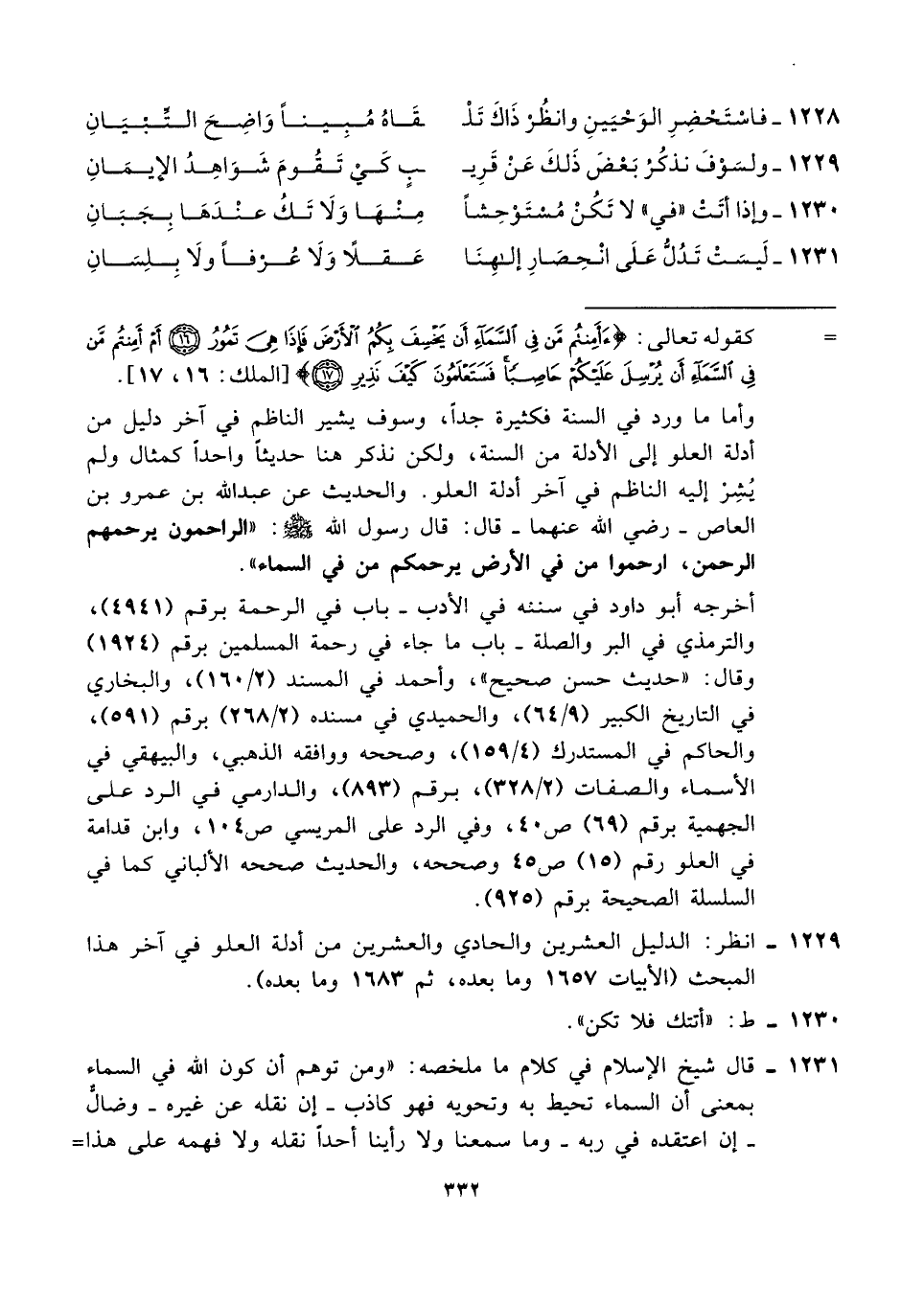 ١٢٢٩ - انظر: الدليل العشرين والحادي والعشرين من أدلة العلو في آخر هذا المبحث (الأبيات ١٦٥٧ وما بعده، ثم ١٦٨٣ وما بعده).