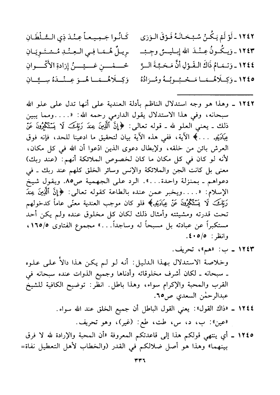 ١٢٤٢ - وهذا هو وجه استدلال الناظم بأدلة العندية على أنها تدل على علو الله سبحانه، وفي هذا الاستدلال يقول الدارمي رحمه الله: " .... ومما يبين ذلك - يعني العلو لله- قوله تعالى: {إِنَّ الَّذِينَ عِنْدَ رَبِّكَ لَا يَسْتَكْبِرُونَ عَنْ عِبَادَتِهِ ... } الاية، ففي هذه الآية بيان لتحقيق ما ادعينا للحد، فإنه فوق العرش بائن من خلقه، ولإبطال دعوى الذين ادّعوا أن الله في كل مكان، لأنه لو كان في كل مكان ما كان لخصوص الملائكة أنهم: (عند ربك) معنى بل كانت الجن والملائكة والإنس وسائر الخلق كلهم عند ربك -في دعواهم- بمنزلة واحدة ... ". الرد على الجهمية ص ٨٥. ويقول شيخ الإسلام: " .... ويخبر عمن عنده بالطاعة كقوله تعالى: {إِنَّ الَّذِينَ عِنْدَ رَبِّكَ لَا يَسْتَكْبِرُونَ عَنْ عِبَادَتِهِ} فلو كان موجب العندية معنًى عامًا كدخولهم تحت قدرته ومشيئته وأمثال ذلك لكان كل مخلوق عنده ولم يكن أحد مستكبرًا عن عبادته بل مسبحًا له وساجدًا ... " مجموع الفتاوى ٥/ ١٦٥، وانظر: ٥/ ٤٠٥.