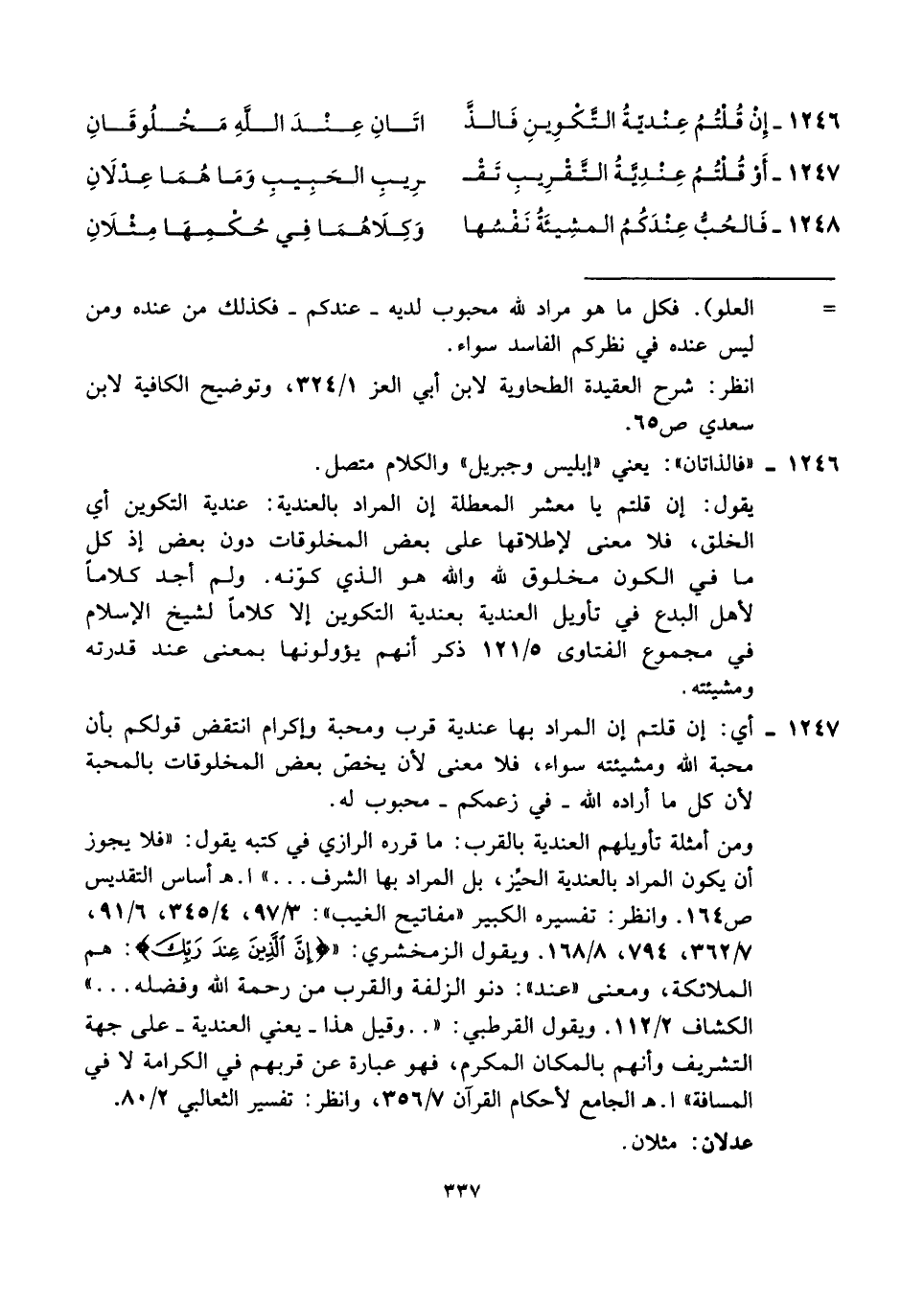 ١٢٤٧ - أي: إن قلتم إن المراد بها عندية قرب ومحبة وإكرام انتقض قولكم بأن محبة الله ومشيئته سواء، فلا معنى لأن يخصّ بعض المخلوقات بالمحبة لأن كل ما أراده الله -في زعمكم- محبوب له.