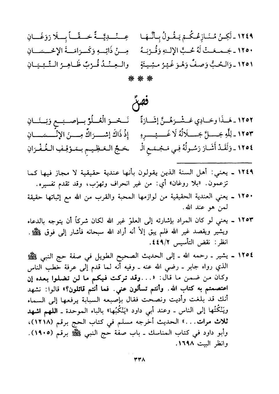 ١٢٥٤ - يشير -رحمه الله- إلى الحديث الصحيح الطويل في صفة حج النبي - صلى الله عليه وسلم - الذي رواه جابر -رضي الله عنه- وفيه أنه لما قدم إلى عرفة خطب الناس وكان من ضمن ما قال: " ... وقد تركت فيكم ما لن تضلوا بعده إن إعتصمتم به كتاب الله. وأنتم تسألون عني. فما أنتم قائلون؟ " قالوا: نشهد أنك قد بلغت وأديت ونصحت فقال بإصبعه السبابة يرفعها إلى السماء ويَنْكُتُها إلى الناس- وعند أبي داود "يَنْكُبُها" بالباء الموحدة- اللهم اشهد ثلاث مرات ... " الحديث أخرجه مسلم في كتاب الحج برقم (١٢١٨)، وأبو داود في كتاب المناسك- باب صفة حج النبي - صلى الله عليه وسلم - برقم (١٩٠٥). وانظر البيت ١٦٩٨.