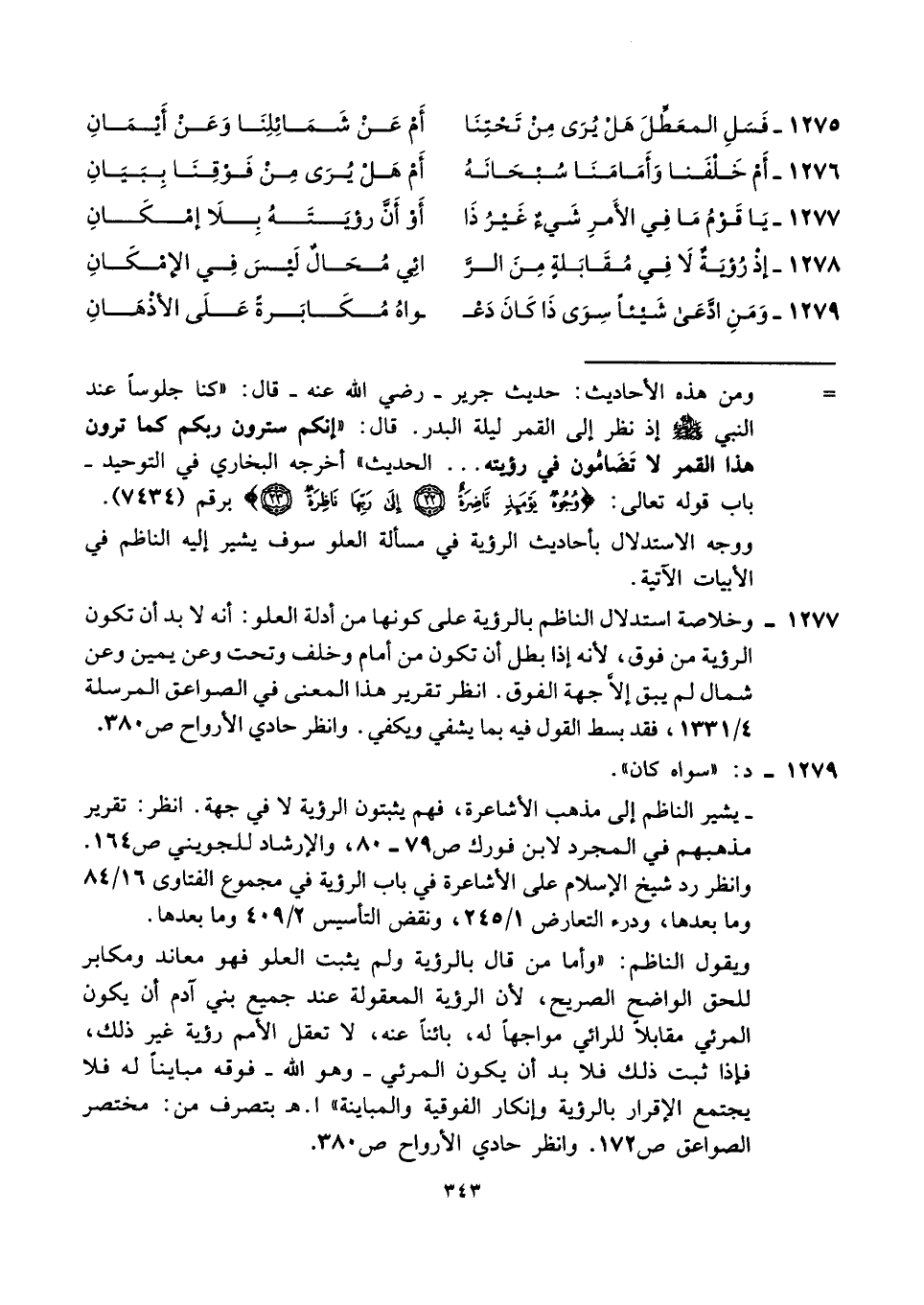 ١٢٧٥ - فَسَلِ المعَطِّلَ هَلْ يُرَى مِن تَحْتِنَا ... أَمْ عَنْ شَمَائِلِنَا وَعَنْ أَيْمَانِ