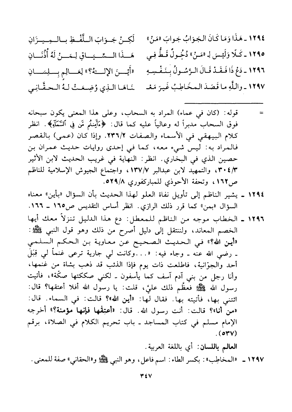 ١٢٩٤ - يشير الناظم إلى تأويل نفاة العلو لهذا الحديث بأن السؤال "بأين" معناه السؤال "بمن" كما قرر ذلك الرازي. انظر أساس التقديس ص ١٦٥ - ١٦٦.