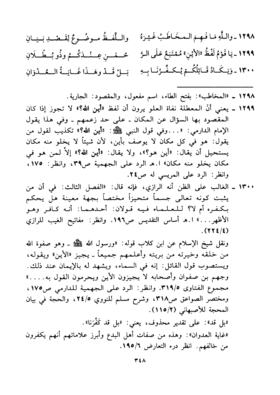 ١٢٩٩ - يعني أنّ المعطلة نفاة العلو يرون أن لفظ "أين الله؟ " لا تجوز إذا كان المقصود بها السؤال عن المكان -على حد زعمهم- وفي هذا يقول الإمام الدارمي: " ... وفي قول النبي - صلى الله عليه وسلم -: "أين الله؟ " تكذيب لقول من يقول: هو في كل مكان لا يوصف بأين، لأن شيئًا لا يخلو منه مكان يستحيل أن يقال: "أين هو؟ "، ولا يقال: "أين الله؟ " إلَاّ لمن هو في مكان يخلو منه مكان" ا. هـ الرد على الجهمية ص ٣٩، وانظر: ١٧٥، وانظر: الرد على المريسي له ص ٢٤.