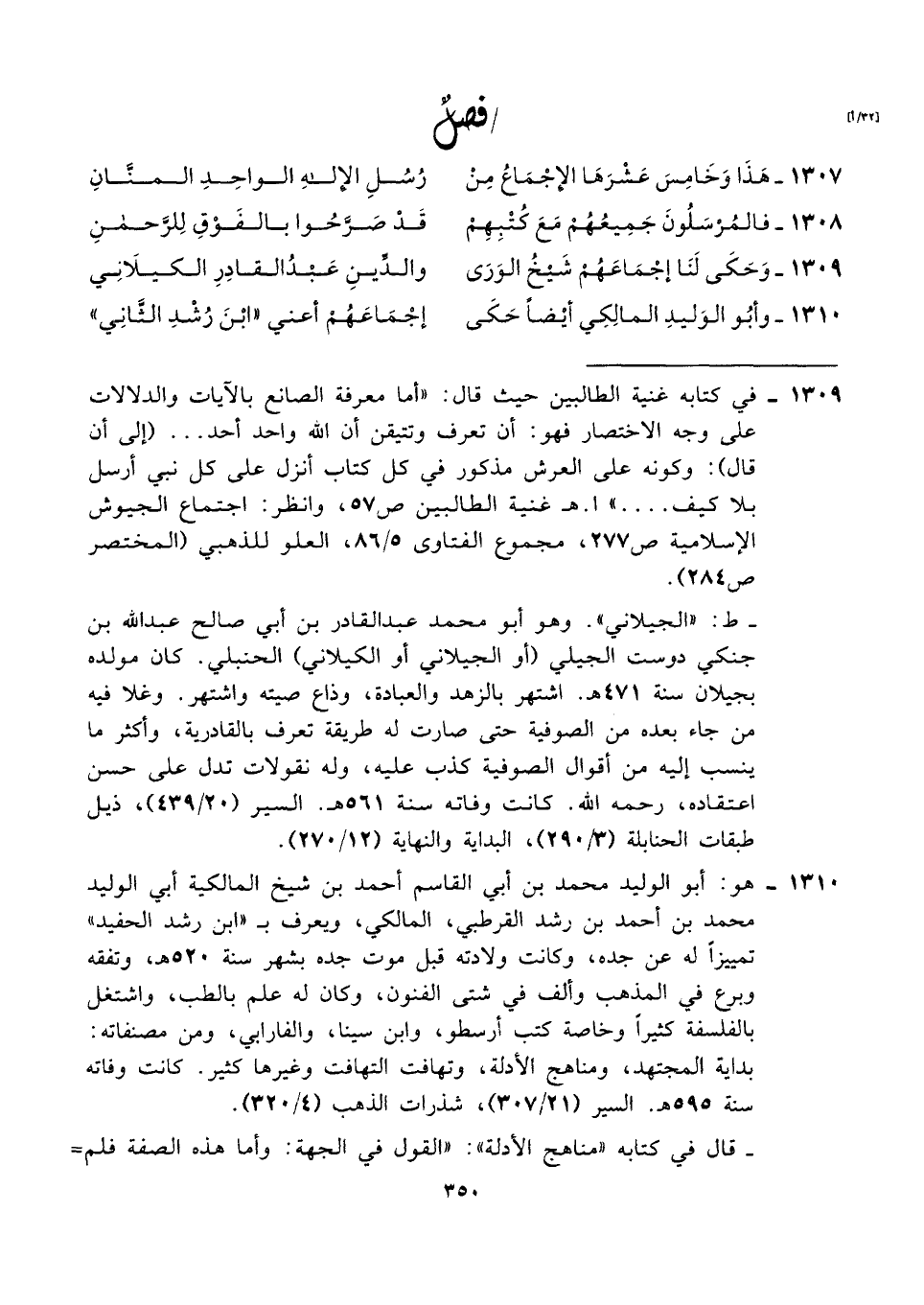 ١٣٠٩ - وَحَكَى لَنَا إجْمَاعَهُمْ شَيْخُ الوَرَى ... والدِّينِ عَبْدُ القادِرِ الكيلَانِي