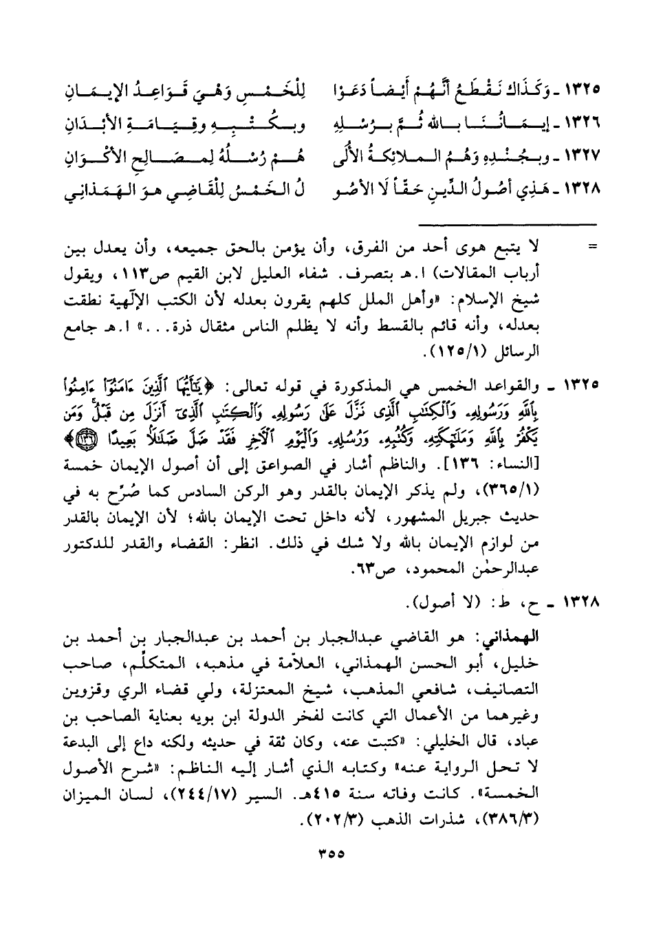 ١٣٢٨ - هَذِي أصُولُ الدِّينِ حَقًّا لَا الأصُو ... لُ الخَمْسُ لِلْقَاضِي هوَ الهَمَذانِي