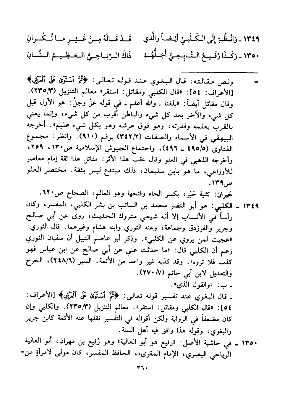 - قال البغوي عند تفسير قوله تعالى: {ثُمَّ اسْتَوَى عَلَى الْعَرْشِ} [الأعراف: ٥٤]: "قال الكلبي ومقاتل: استقر". معالم التنزيل (طم ٢٣٥). والكلبي وإن كان مضعفًا في الرواية ولكن أقواله في التفسير نقلها عنه الأئمة كابن جرير والبغوي، وقوله هذا وافق فيه أهل السنة.
