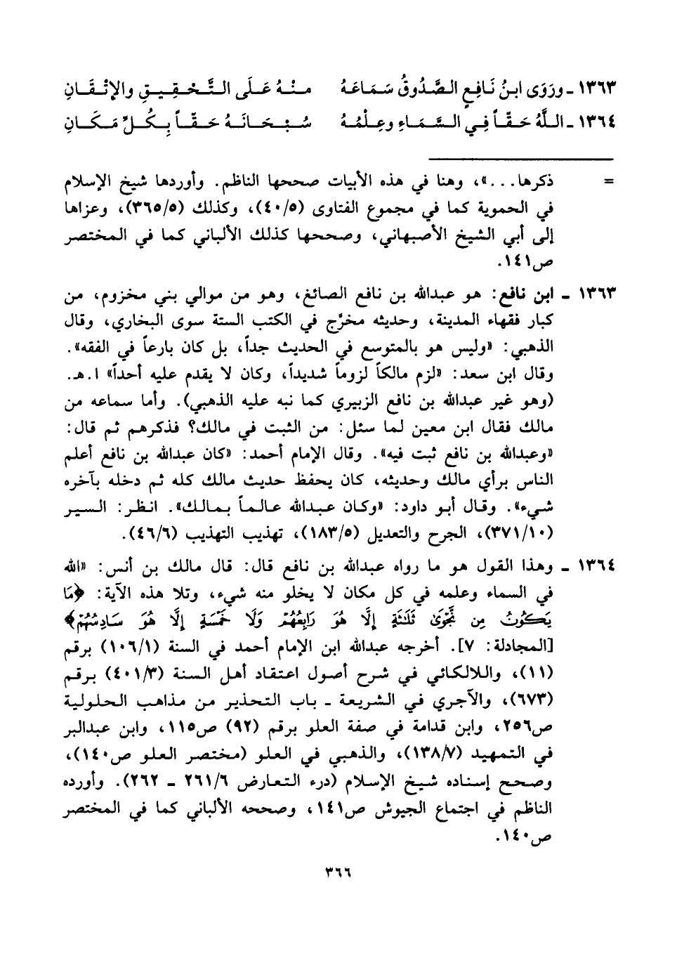 ١٣٦٣ - ابن نافع: هو عبد الله بن نافع الصائغ، وهو من موالي بني مخزوم، من كبار فقهاء المدينة، وحديثه مخرج في الكتب الستة سوى البخاري، وقال الذهبي: "وليس هو بالمتوسع في الحديث جدًا، بل كان بارعًا في الفقه". وقال ابن سعد: "لزم مالكًا لزومًا شديدًا، وكان لا يقدم عليه أحدًا" ا. هـ.