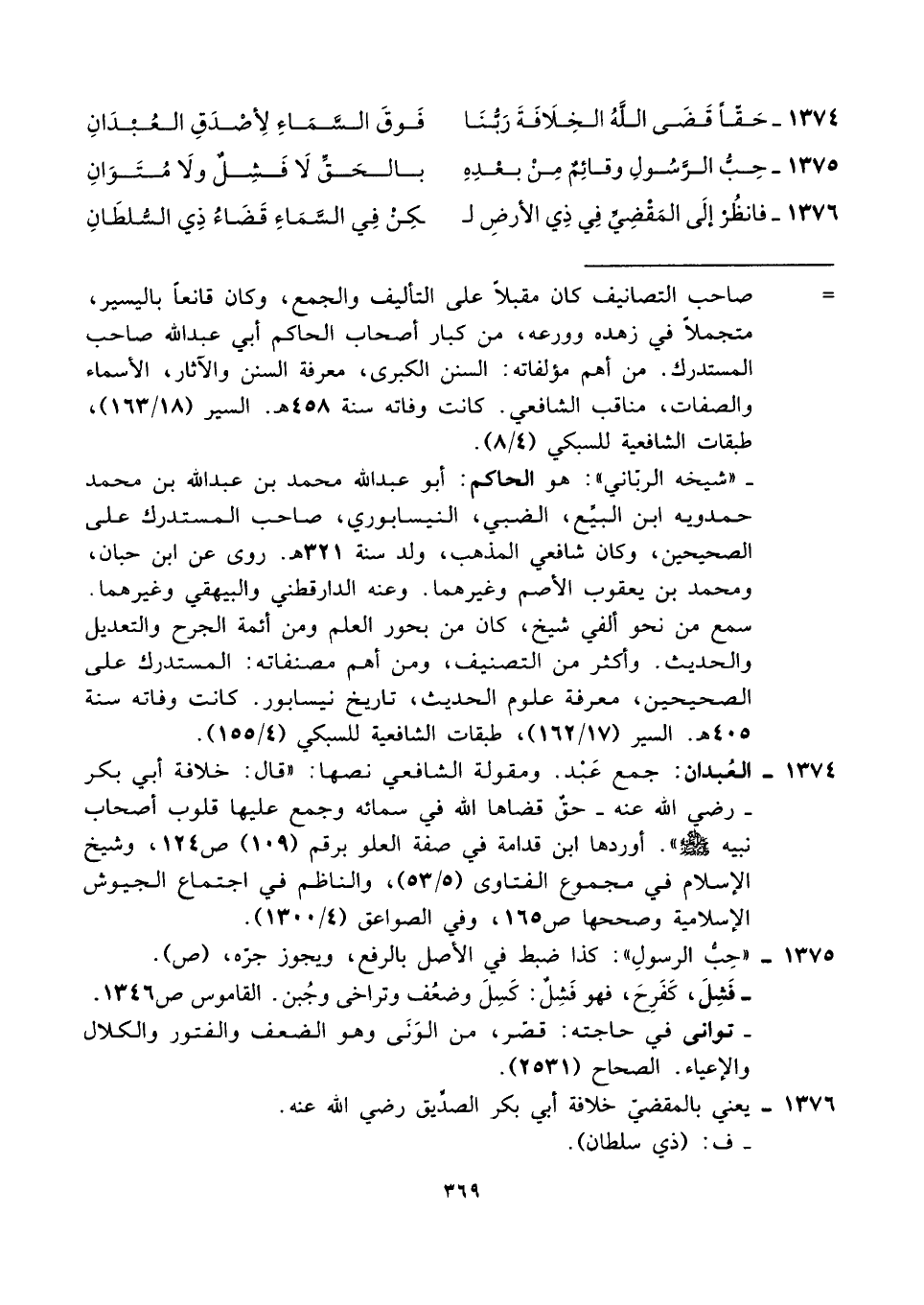 ١٣٧٤ - العُبدان: جمع عَبْد. ومقولة الشافعي نصها: "قال: خلافة أبي بكر -رضي الله عنه- حقٌ قضاها الله في سمائه وجمع عليها قلوب أصحاب نبيه - صلى الله عليه وسلم -". أوردها ابن قدامة في صفة العلو برقم (١٠٩) ص ١٢٤، وشيخ الإسلام في مجموع الفتاوى (٥/ ٥٣)، والناظم في اجتماع الجيوش الإسلامية وصححها ص ١٦٥، وفي الصواعق (٤/ ١٣٠٠).