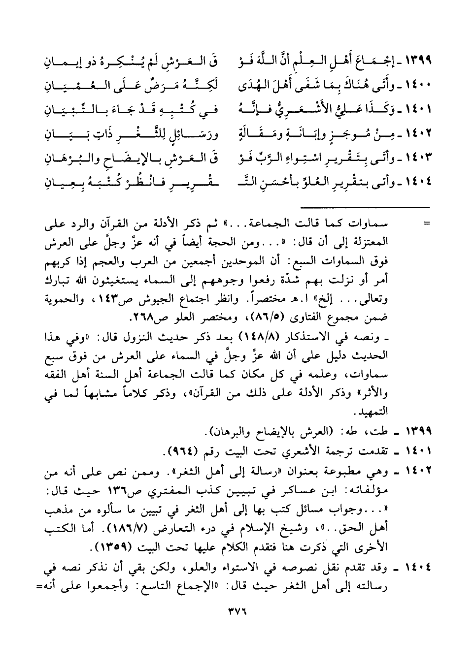 ١٤٠٣ - وأتَى بِتَقْريرِ اسْتِواءِ الرَّب فَوْ ... قَ العَرشِ بالإيضَاحِ والبُرْهَانِ