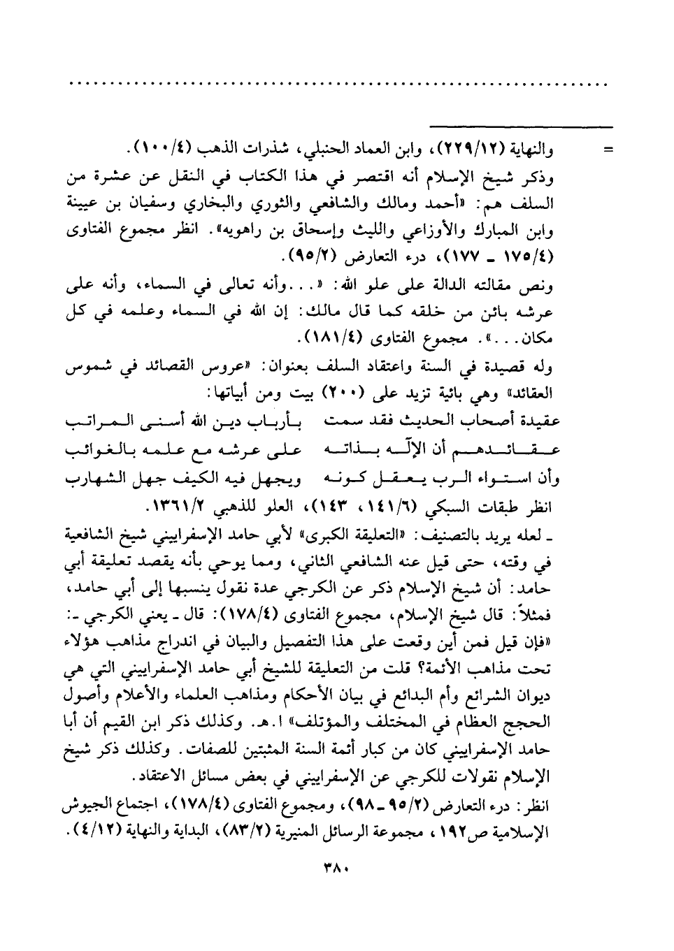وذكر شيخ الإسلام أنه اقتصر في هذا الكتاب في النقل عن عشرة من السلف هم: "أحمد ومالك والشافعي والثوري والبخاري وسفيان بن عيينة وابن المبارك والأوزاعي والليث وإسحاق بن راهويه". انظر مجموع الفتاوى (٤/ ١٧٥ - ١٧٧)، درء التعارض (٢/ ٩٥).