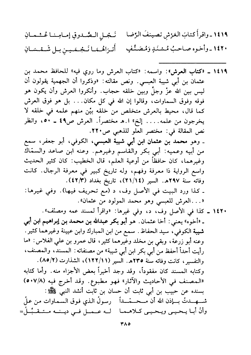 ١٤١٩ - "كتاب العرش": واسمه: "كتاب العرش وما روي فيه" للحافظ محمد بن عثمان بن أبي شيبة العبسي. ونص مقالته: "وذكروا أن الجهمية يقولون أن ليس بين الله عزَّ وجلَّ وبين خلقه حجاب. وأنكروا العرش وأن يكون هو فوقه وفوق السماوات، وقالوا إن الله في كل مكان ... بل هو فوق العرش كما قال، محيط بالعرش متخلص من خلقه بيِّن منهم علمه في خلقه لا يخرجون من علمه .... إلخ" ا. هـ مختصرًا. العرش ص ٤٩ - ٥٠، وانظر نص المقالة في: مختصر العلو للذهبي ص ٢٢٥.
