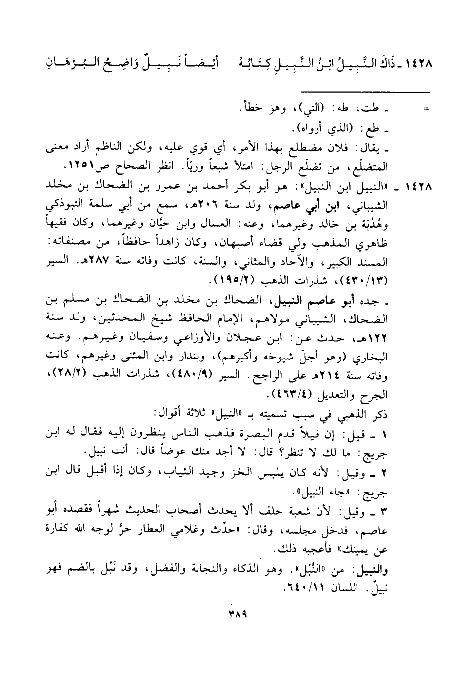 ١٤٢٨ - "النبيل ابن النبيل": هو أبو بكر أحمد بن عمرو بن الضحاك بن مخلد الشيباني، ابن أبي عاصم، ولد سنة ٢٠٦ هـ، سمع من أبي سلمة التبوذكي وهُدْبَة بن خالد وغيرهما، وعنه: العسال وابن حيَّان وغيرهما، وكان فقيهًا ظاهري المذهب ولي قضاء أصبهان، وكان زاهدًا حافظًا، من مصنفاته: المسند الكبير، والآحاد والمثاني، والسنة، كانت وفاته سنة ٢٨٧ هـ. السير (١٣/ ٤٣٠)، شذرات الذهب (٢/ ١٩٥).