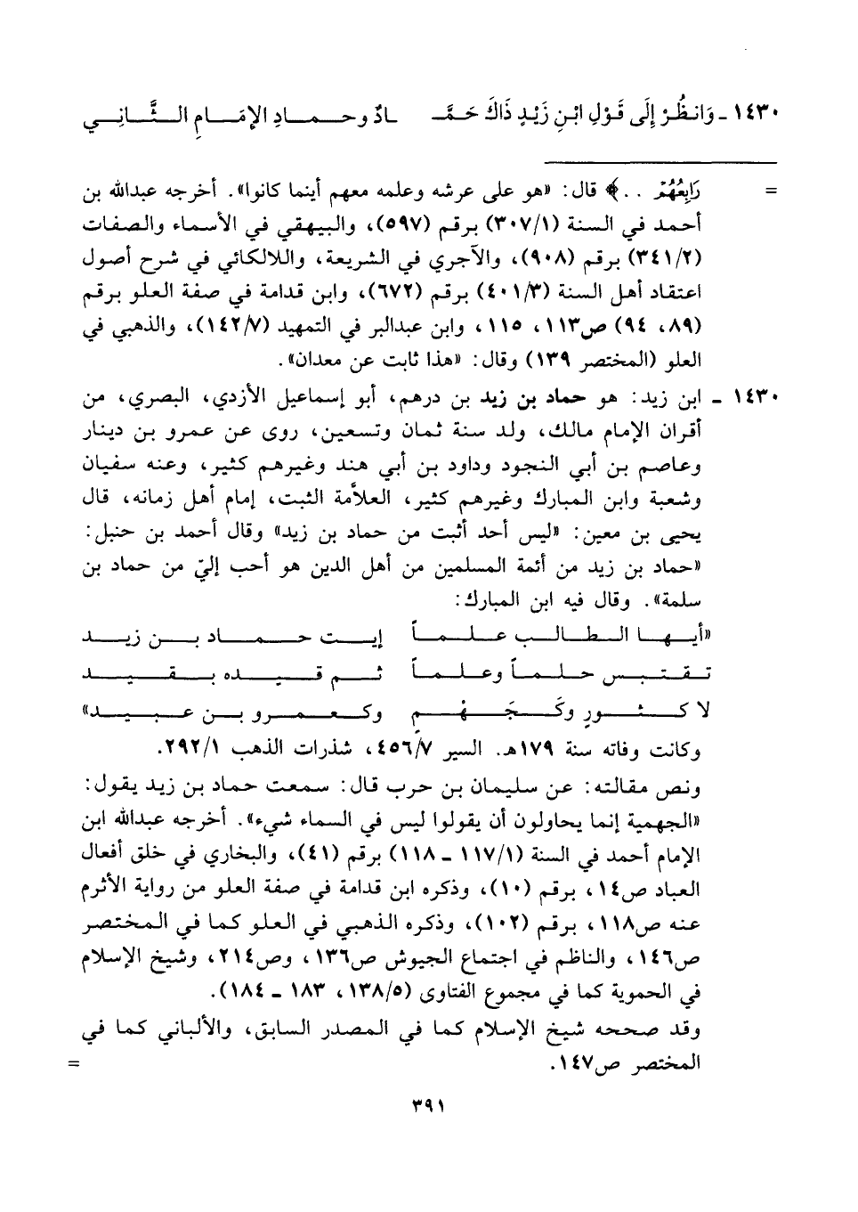 ١٤٣٠ - ابن زيد: هو حماد بن زيد بن درهم، أبو إسماعيل الأزدي، البصري، من أقران الإمام مالك، ولد سنة ثمان وتسعين، روى عن عمرو بن دينار وعاصم بن أبي النجود وداود بن أبي هند وغيرهم كثير، وعنه سفيان وشعبة وابن المبارك وغيرهم كثبر، العلَاّمة الثبت، إمام أهل زمانه، قال يحيى بن معين: "ليس أحد أثبت من حماد بن زيد" وقال أحمد بن حنبل: "حماد بن زيد من أئمة المسلمين من أهل الدين هو أحب إليّ من حماد بن سلمة". وقال فيه ابن المبارك: