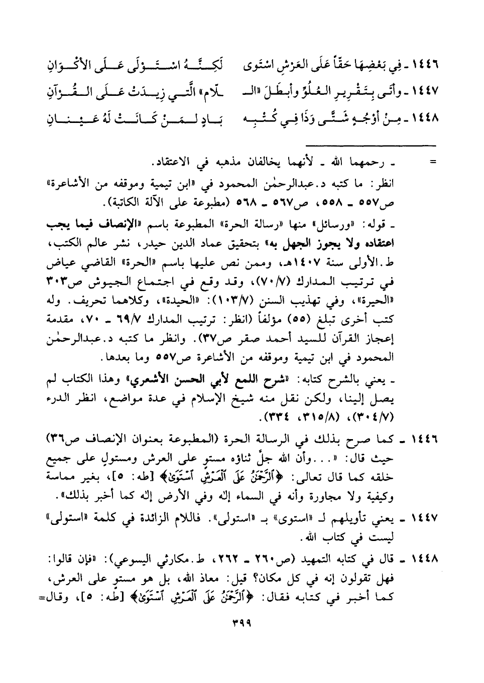 ١٤٤٦ - فِي بَعْضِهَا حَقًّا عَلَى العَرشِ اسْتَوى ... لَكِنَّهُ اسْتَوْلَى عَلَى الأكْوَانِ